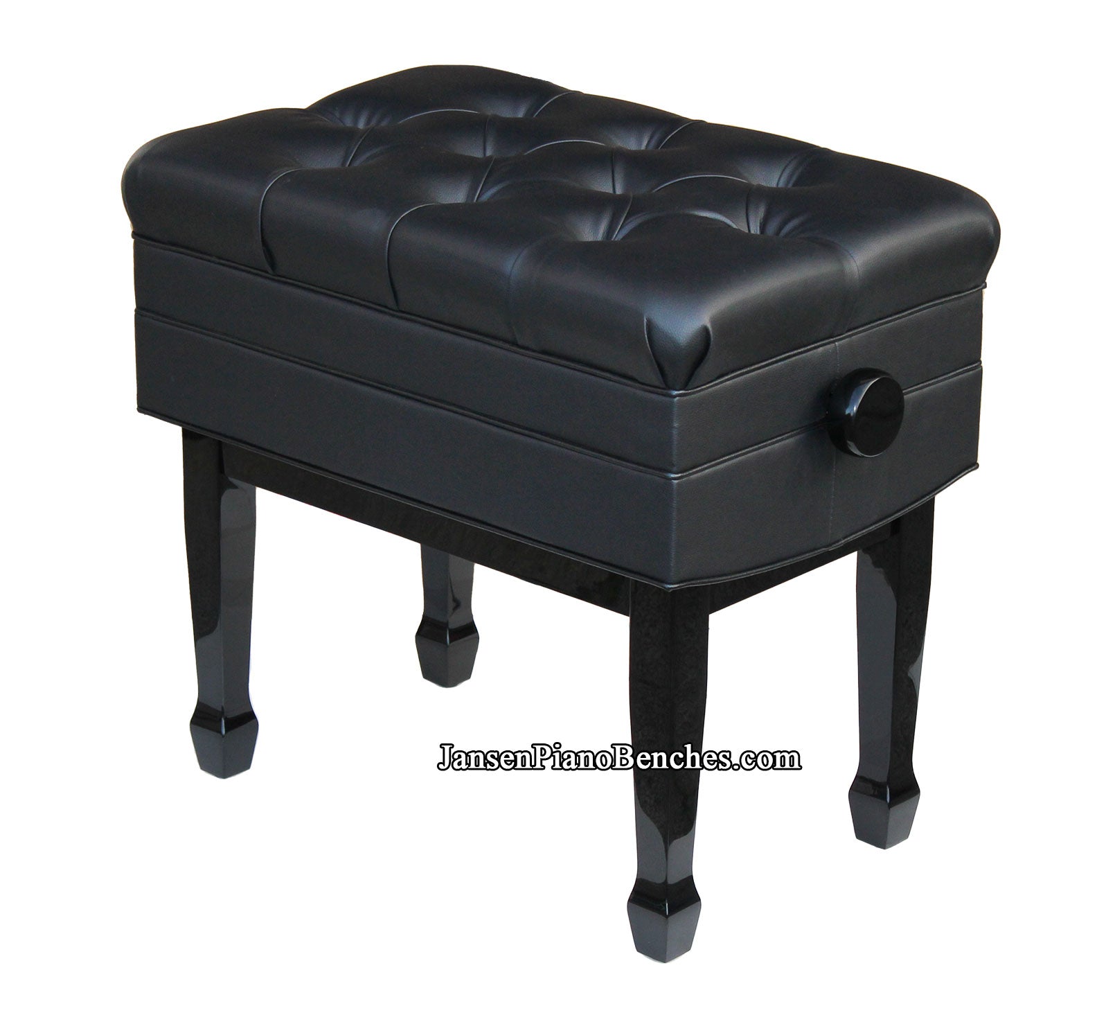 The upgraded deluxe adjustable piano bench comes with a full-size sheet music storage department located underneath the seat, allowing you to keep your sheet music organized and within easy reach. The attractive diamond tufted padding is plush and comfortable, and the top is constructed of durable, furniture grade vinyl. The upholstered top of the bench has the "skirt," which hides the adjustment mechanism when the bench is raised (if you look below the adjustment knob, that extra few inches of material is the skirt--if the bench does not have this, you will see the gap between the frame and the upholstered top when the seat is raised, exposing the mechanism arms). The spade leg style adds an elegant touch to the design.