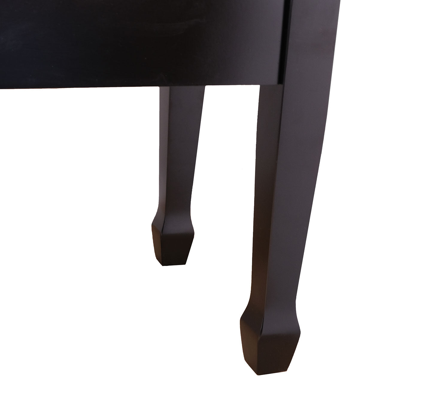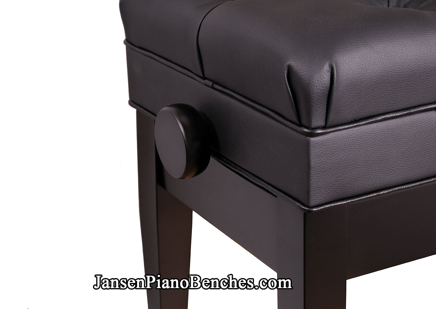 Attractive diamond tufted top, using furniture grade high quality vinyl, with wooden adjustment knobs matching the finish of the bench. Solid hardwood construction. Spade leg style. Available in black, walnut and mahogany, with the standard satin or high polish finish.