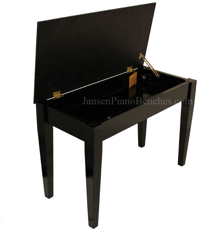 Supported with heavy duty brass hardware, the Jansen grand piano bench features a routed in music compartment--compared to most of the foreign imported benches, which only staple in their music compartments. By doing this, the wood bottom not only offers a sturdy surface for the heaviest music books, it also acts as structural reinforcement for the entire bench. The depth of the sheet music storage area is 2-3/4".