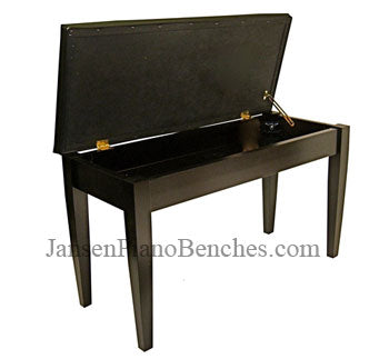 Supported with heavy duty brass hardware, the Jansen piano bench features a routed in music compartment--compared to most of the foreign imported benches, which only staple in their music compartments. By doing this, the wood bottom not only offers a sturdy surface for the heaviest music books, it also acts as structural reinforcement for the entire bench. The depth of the sheet music storage area is 2-3/4".