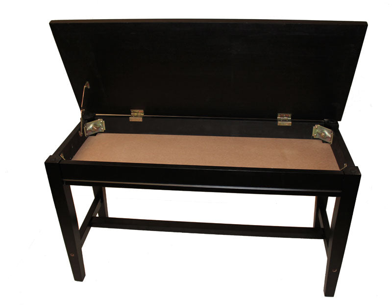 This imported piano bench is a heavy-duty wood top piano bench, designed with a reinforcement crossbar, for extra stability and durability. Features a full-size sheet music storage compartment, measuring 2-3/8" deep. The bottom of the music compartment is routed in for additional strength. The bench is 19.25" tall, and measures 29.75" (wide) x 14.5" (length).