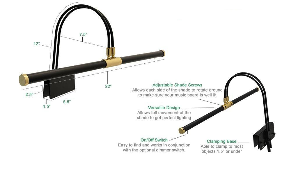 The clamp is able to be fitted to most pianos and objects one and a half inches (1.5”) or less. The shade is separated into two sides, each side being able to rotate. The pivot arms on the piano allow the lamp to swivel horizontally, and allow you to change the angle the lamp aims towards, ensuring that you are getting light right where it is needed.