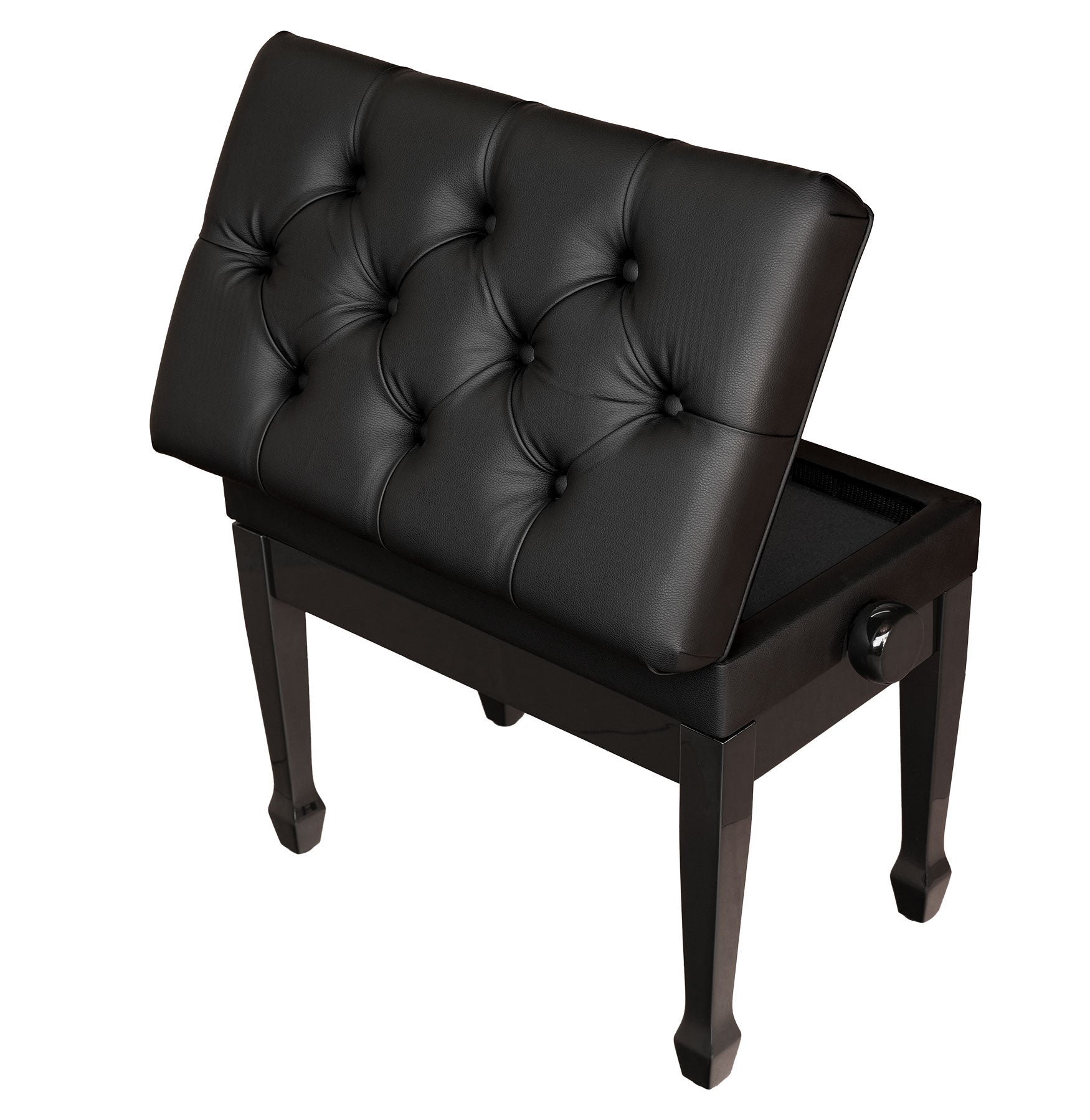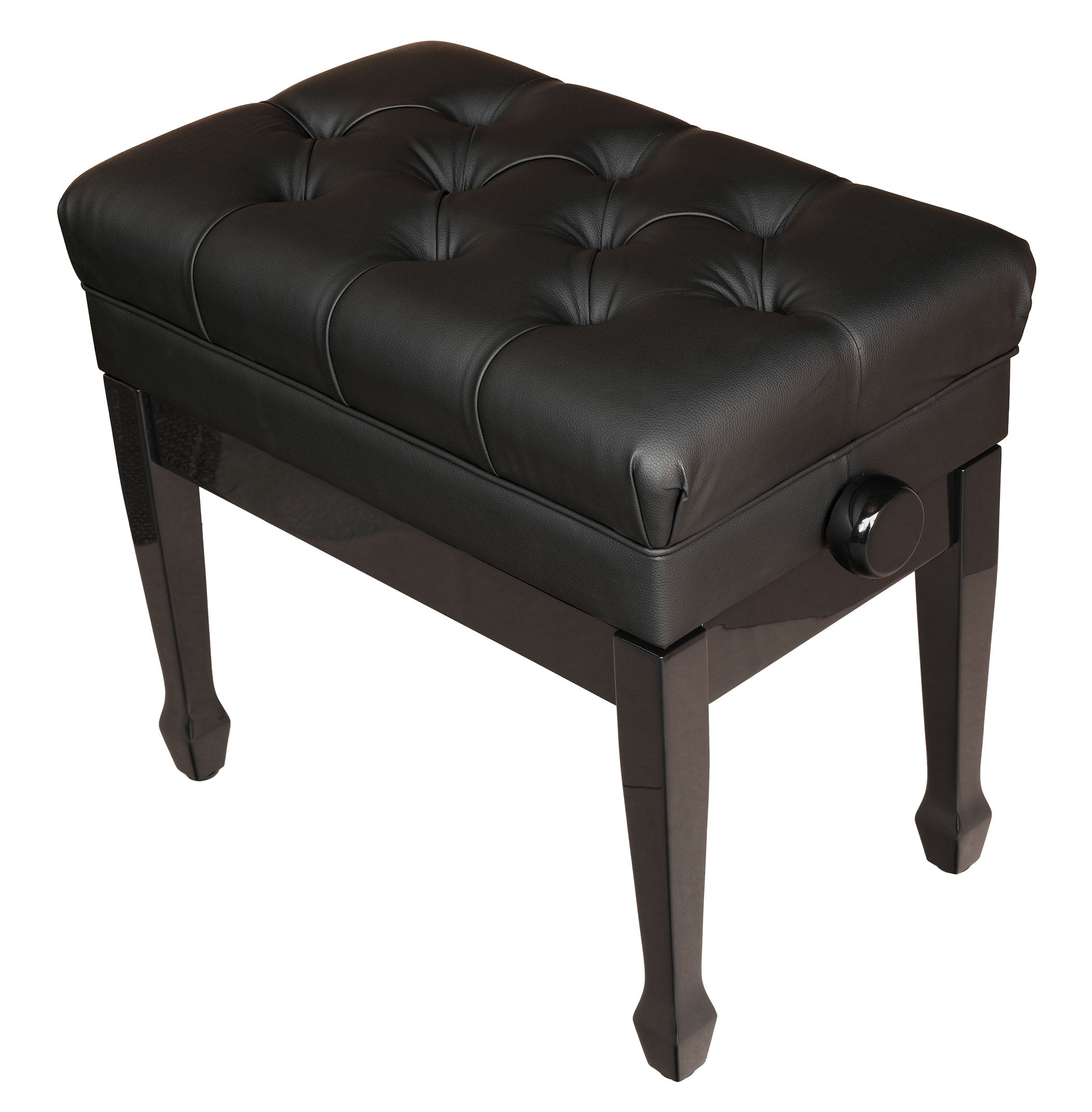 This imported adjustable piano bench is a practical and attractive choice for any pianist. Made from durable hardwood birch, it’s available in both high polish black and satin (matte) black finishes. The padded top of the bench is upholstered in furniture-grade vinyl and features a tufted design with 10 buttons for a classic look.