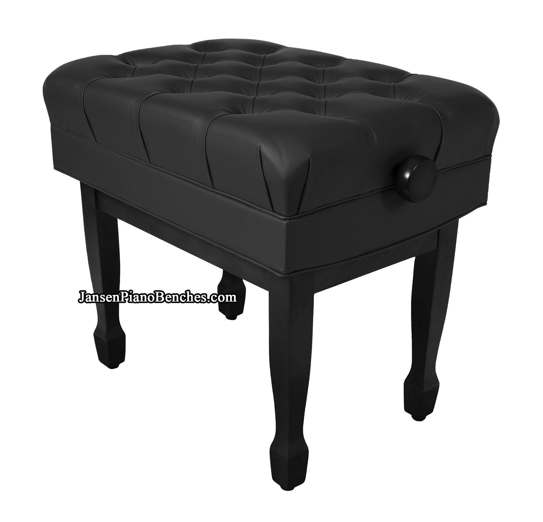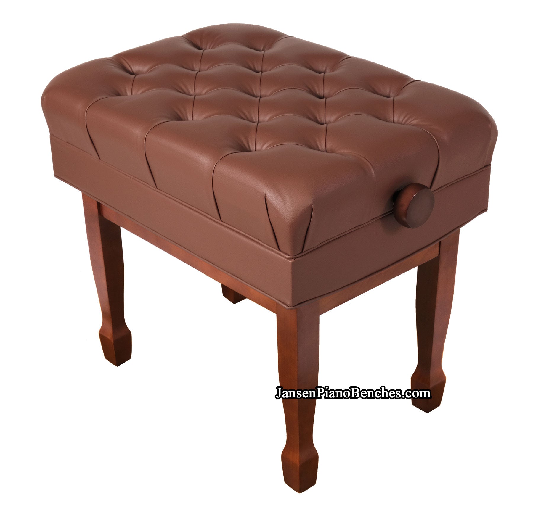 This imported artist piano bench measures 24-1/2" x 17-3/4", and adjusts in height from 19.5" to 23". A "true artist bench," this bench does have the skirt that goes around the bottom of the upholstered top to help hide the mechanism when the bench is raised. Using furniture grade vinyl upholstery, the quality diamond tufting gives a luxurious appearance.