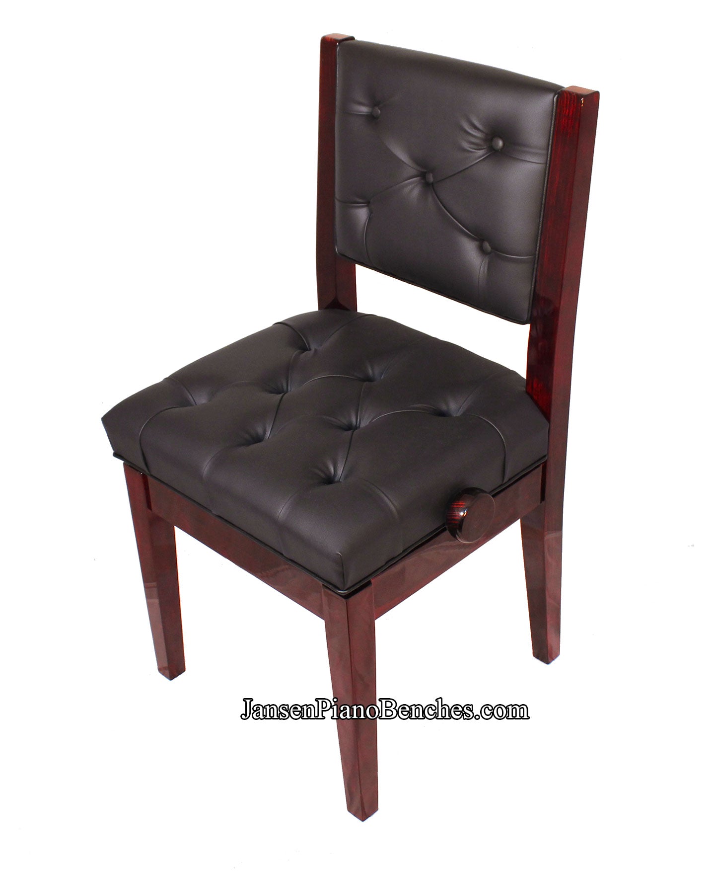 Jansen discontinued their production of the Jansen piano chair a few years ago. Due to popular request, we are happy to offer this quality imported adjustable piano chair as an alternative. It is constructed of 100% hardwood, and adjusts in height from 18" to 21.5". The padded seat measures 17.5" x 18.5". The bottom of the legs have felt padding, to protect your floors. Available in black, walnut and mahogany finishes.