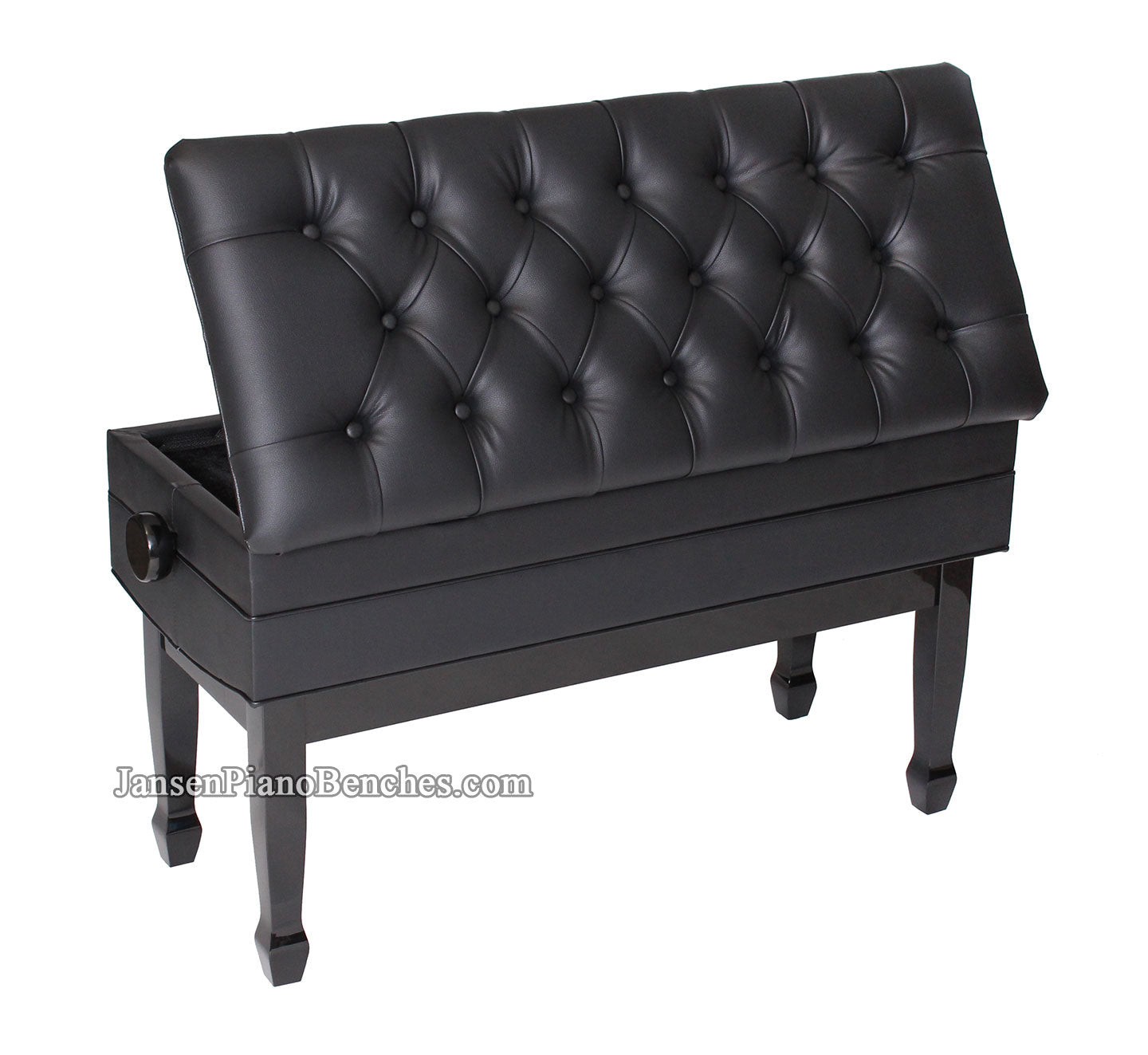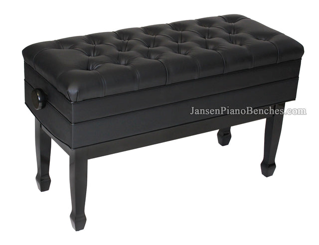 Extra-wide imported duet artist bench piano measures 34" x 15", and adjusts in height from 18.5" to 21" via two wooden adjustment knobs on the side of the bench that are finished to match the frame. Features a full size, felt-lined sheet music storage compartment. The upholstered top has the attractive diamond tufted top design, using furniture grade high quality vinyl. Solid hardwood construction with brass hardware, the adjustment mechanism is made out of solid steel, and uses the dual-scissor lift system with upgraded 3/4" solid steel screw drive. Popular spade leg style. This is a "true artist bench," meaning it does have the skirt going around the bottom of the upholstered top of the bench, which helps hide the adjustment mechanism when raised.