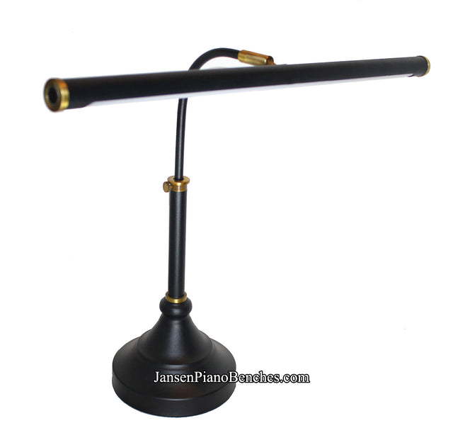 Luxurious LED piano lamp in a black satin finish with brass accents. Lamp adjusts in height from 13.75" to 16.5", and has a 19.5" wide light shade that swivels to provide optimal lighting (the lamp shade connects to the bar via a ball joint, so you can adjust it vertically and horizontally). Modern updated design, a unique feature of this lamp is that it has 3 brightness options, all controlled by the touch-button on the right side of the lamp shade. A complaint seen on many lamps is the on/off switch is located far down the cord, making it a bit difficult to reach as it's draped over the side of the piano. With this lamp, simply tap the button to turn it on and off. The LED lighting is a soft warm light, rated at 5 Watts and 3000k. The piano light plugs into your electrical outlet--it is not battery operated.