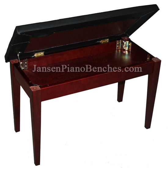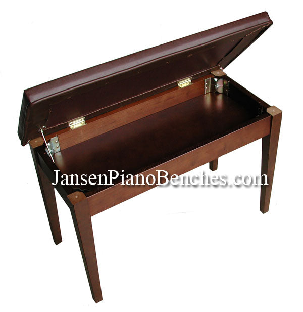 This imported upholstered piano bench is an attractive and sturdy piano bench constructed of solid wood, with a comfortable box-top design, padded vinyl upholstered seat, and a deep music compartment. All equipped with brass plated hinges and lid supports.