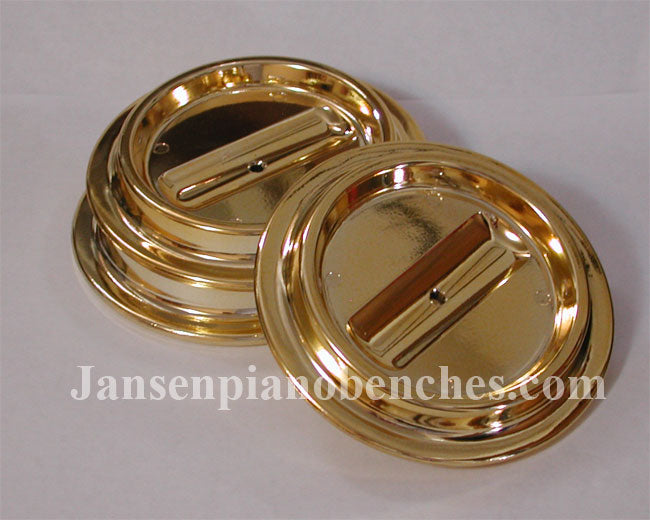 These luxurious piano caster cups are brass plated lucite, and will enhance the elegance of your piano and room decor (Lucite is a strong acrylic product, that is practically unbreakable). They measure: 4-1/2" Outside Diameter, 2-3/4" Inside Diameter. Note that the caster cups are not made out of actual brass, and that it is a lucite plating.