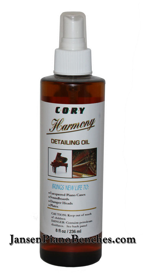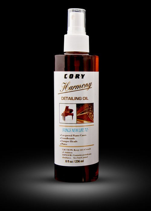 Cory Harmony Detailing Oil moisturizes and shines the wood finish on your piano. Made of a a premium blend of the finest oils that safely moisturize and shine all wood tone surfaces. Great for pianos, as well as other wood furniture and wood instruments. Use safely on all piano cases, sound boards, hardware, damper heads, and plates. Give your piano that beautiful sheen.