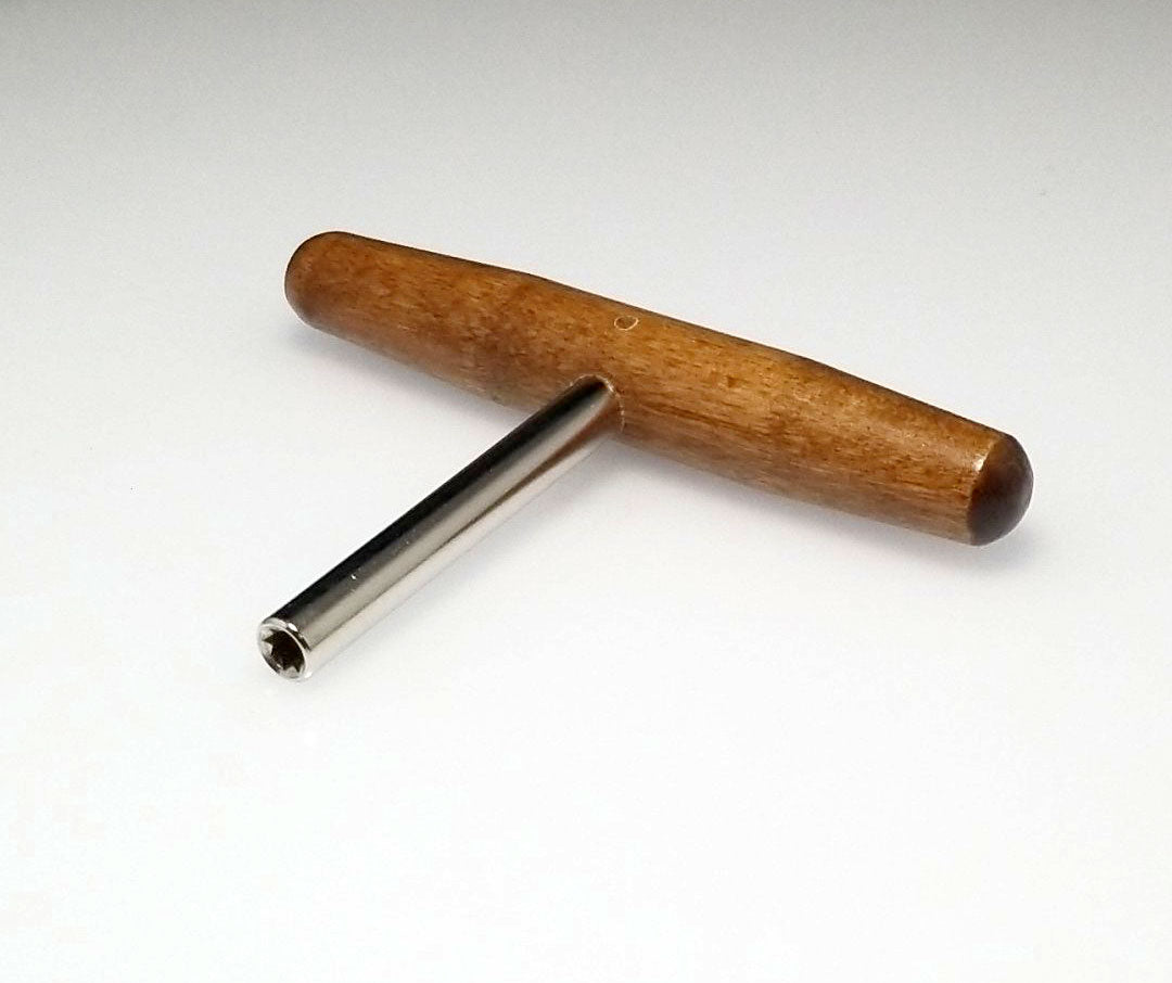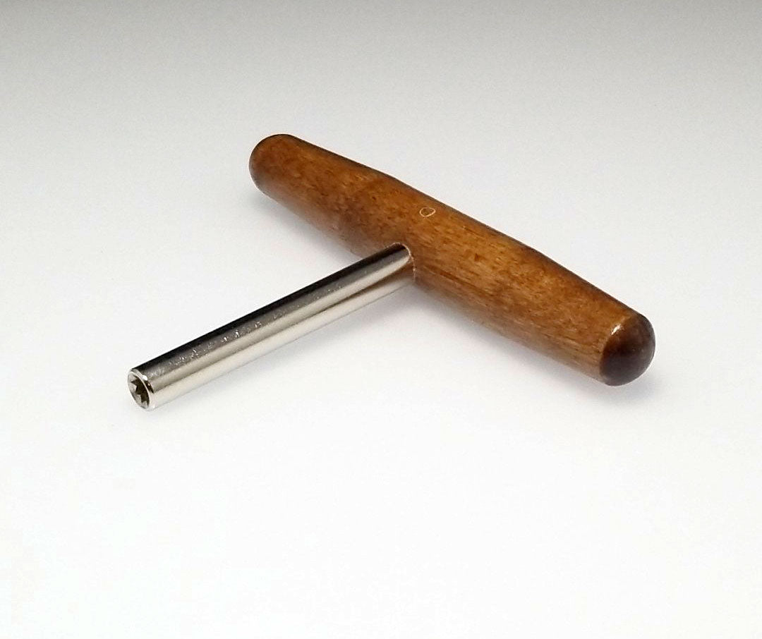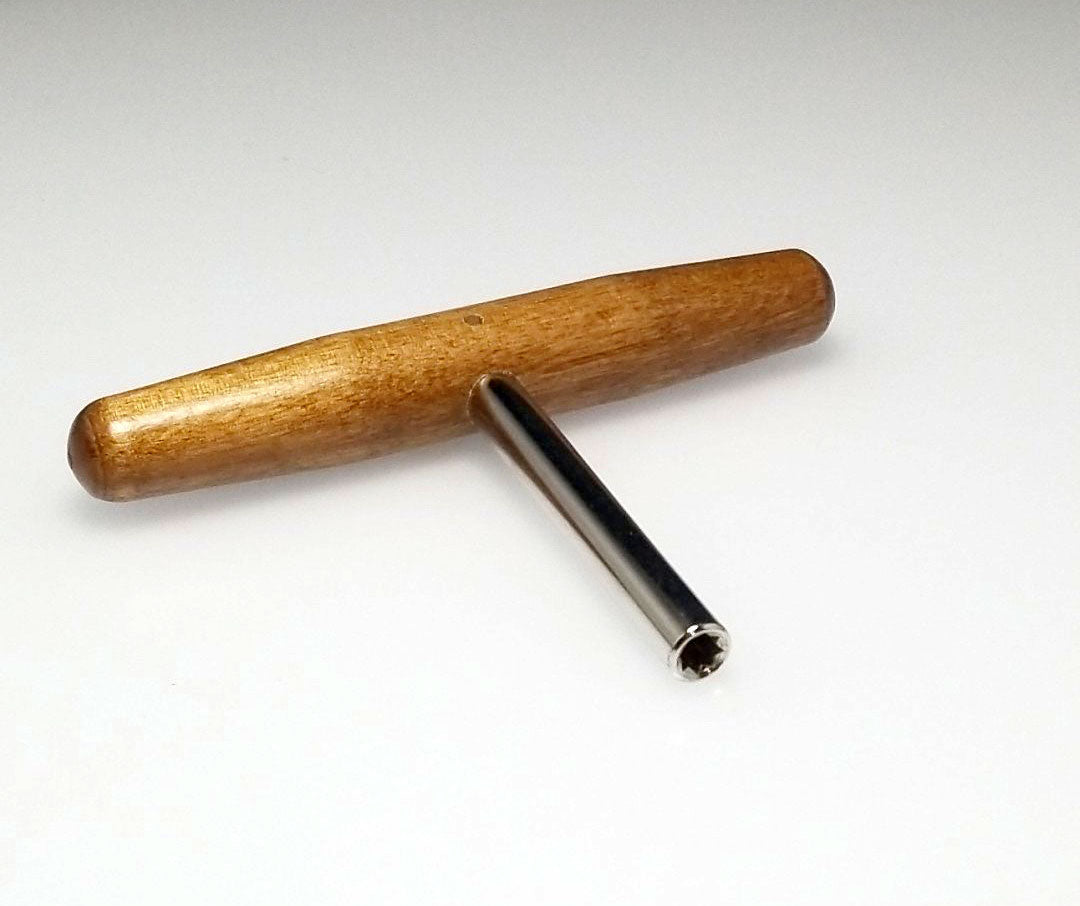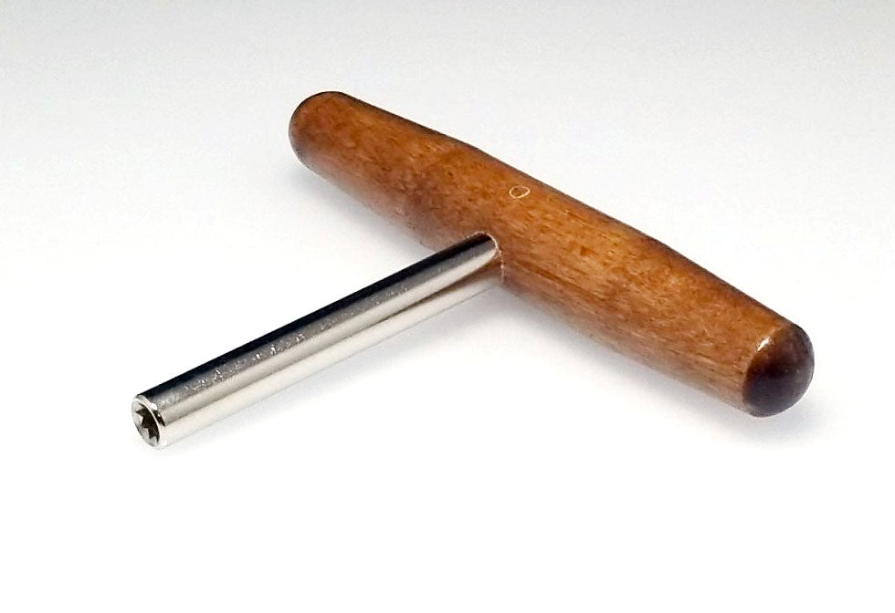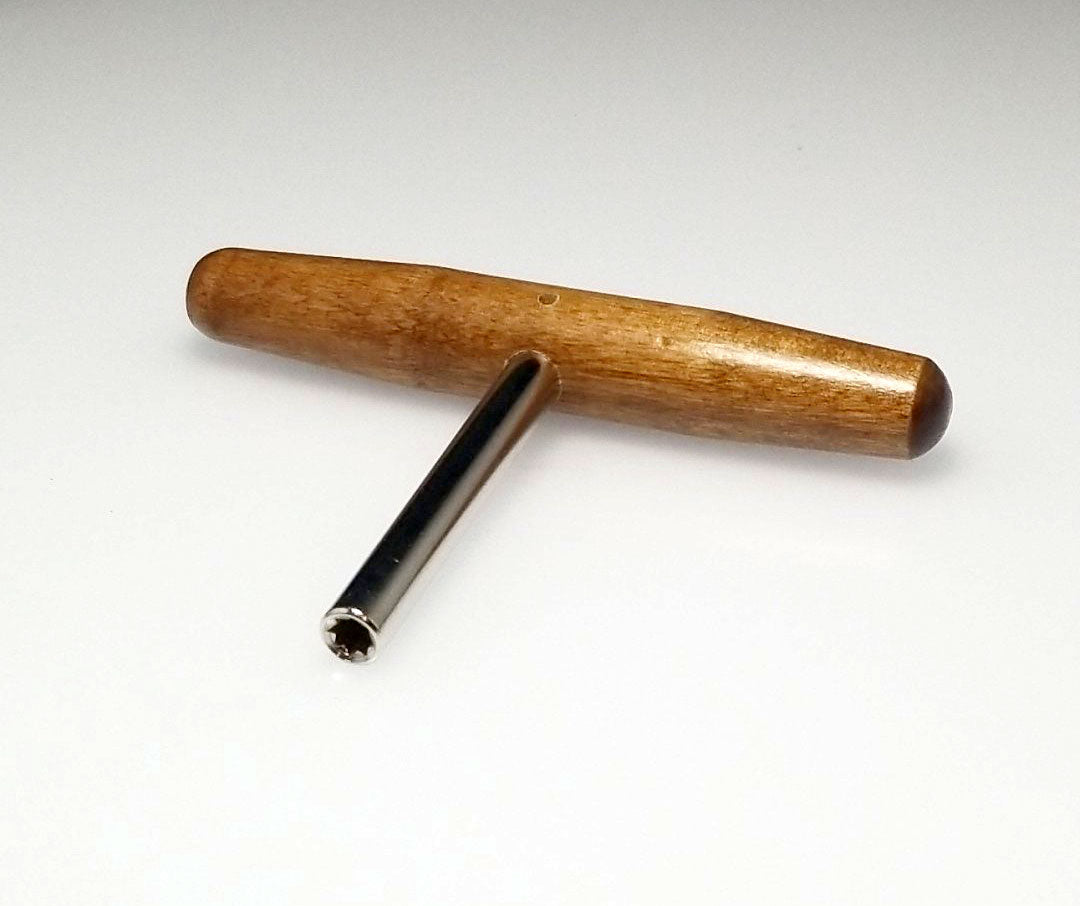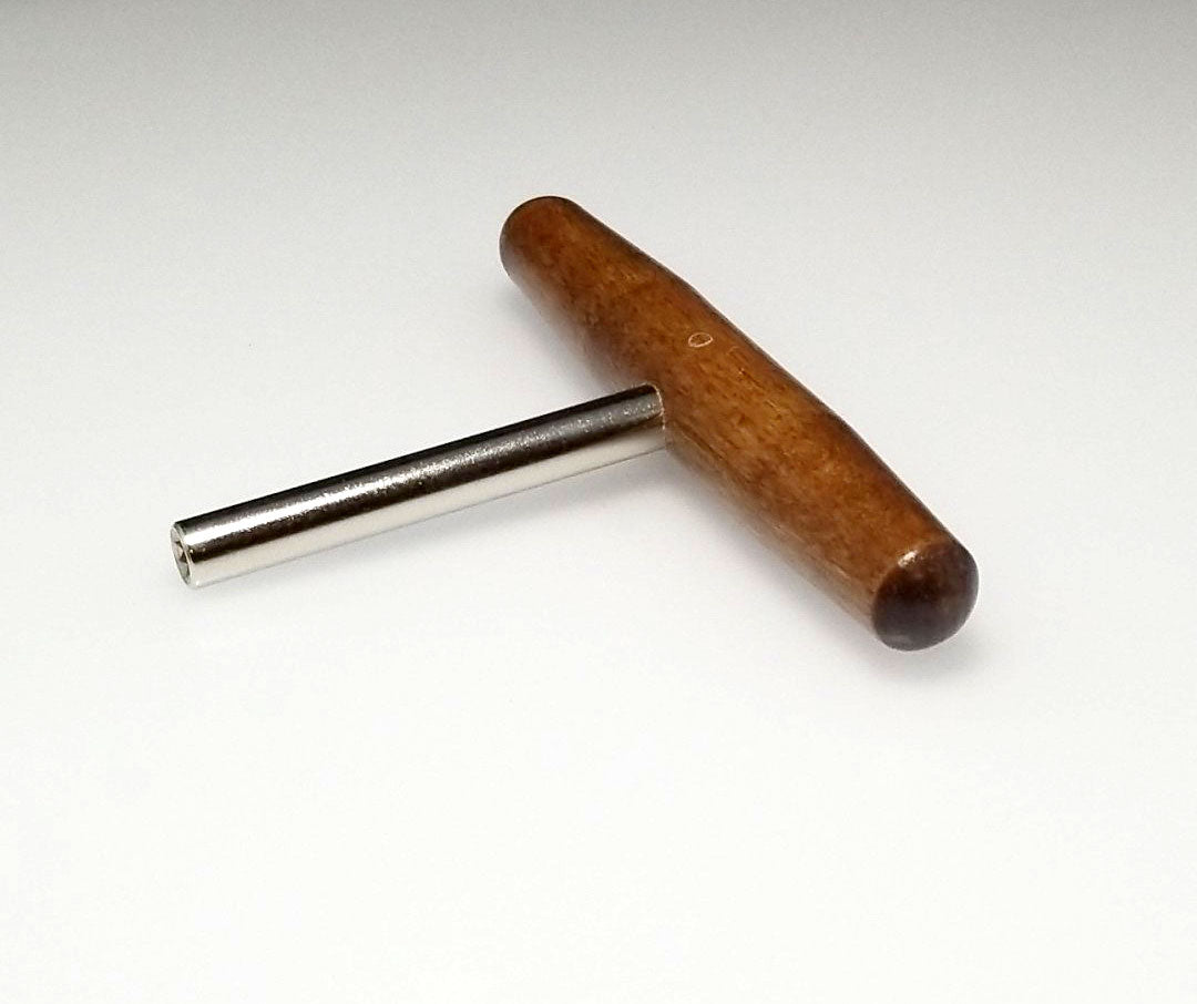 This harpsichord tuning wrench can be used on zithers, dulcimers, harps and harpsichords. Convenient T shaped design, with a 3.5" steel shaft and 5" hardwood handle. Star tip wrench allows you to tune most 4mm (1/8") square tuning pins from multiple angles. Quality piano tool manufactured in the United States.