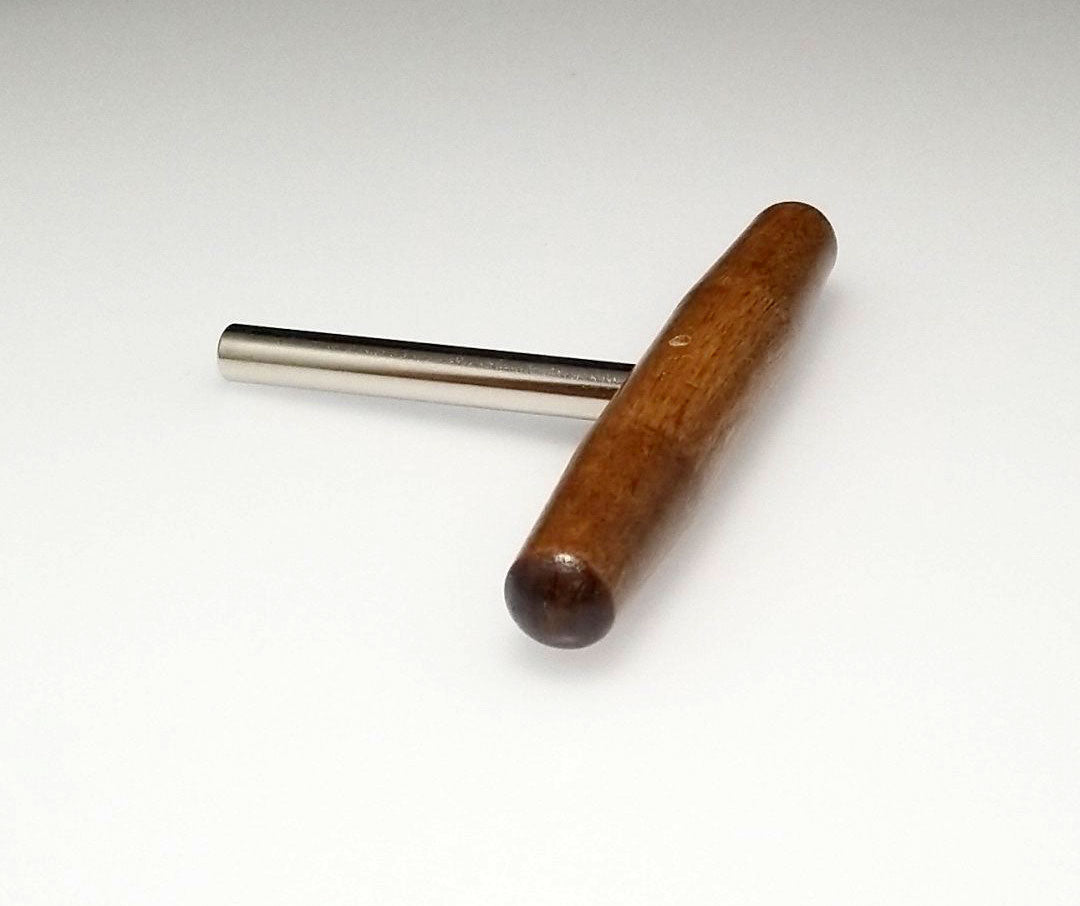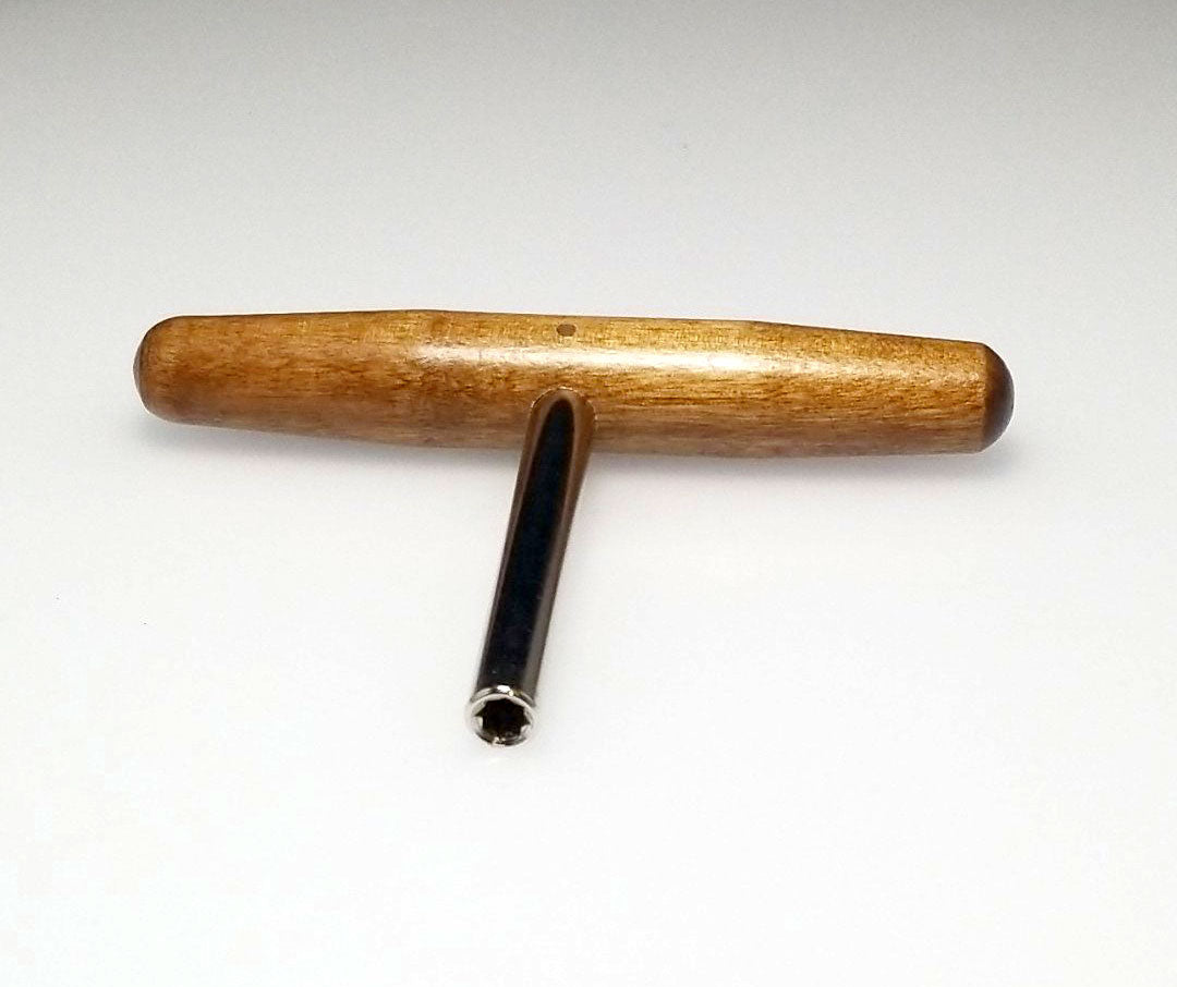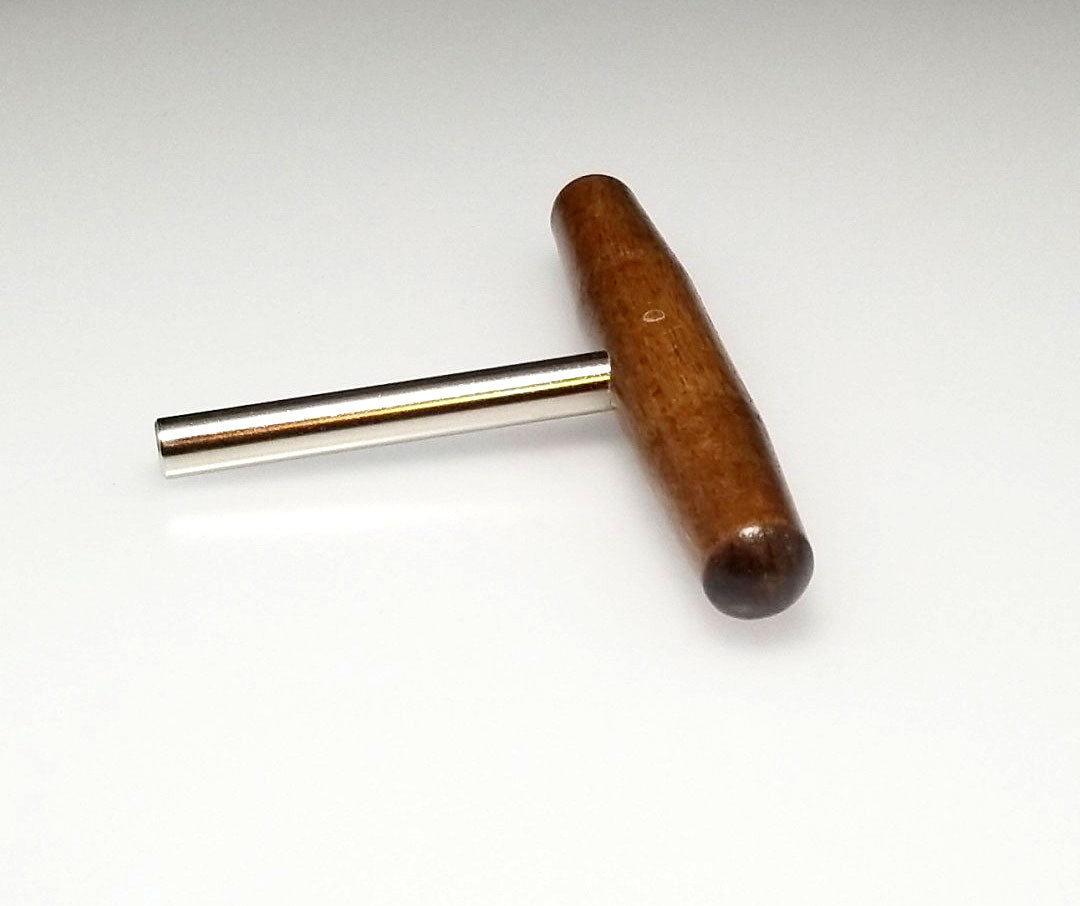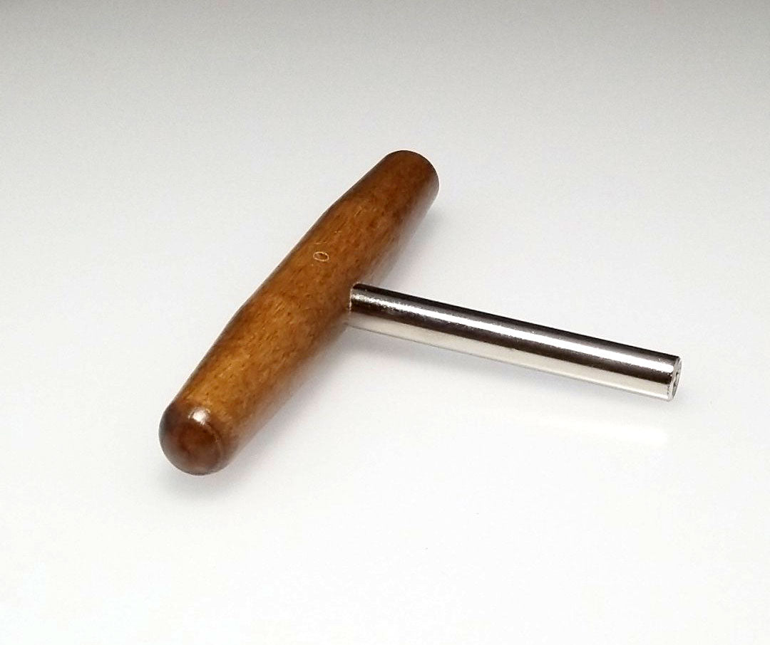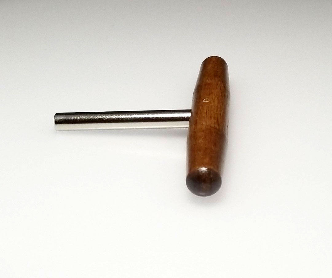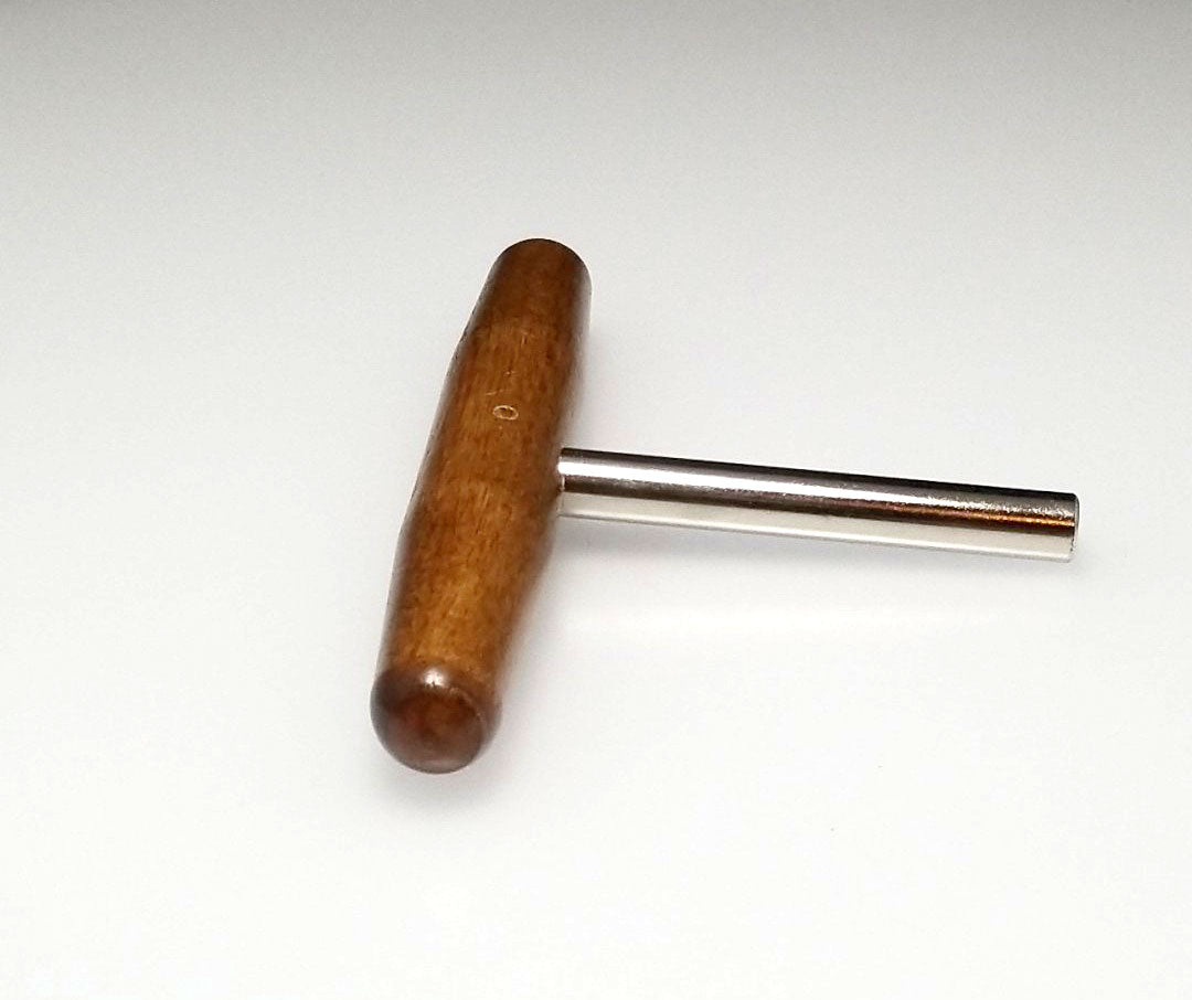 This harpsichord tuning wrench can be used on zithers, dulcimers, harps and harpsichords. Convenient T shaped design, with a 3.5" steel shaft and 5" hardwood handle. Star tip wrench allows you to tune most 4mm (1/8") square tuning pins from multiple angles. Quality piano tool manufactured in the United States.