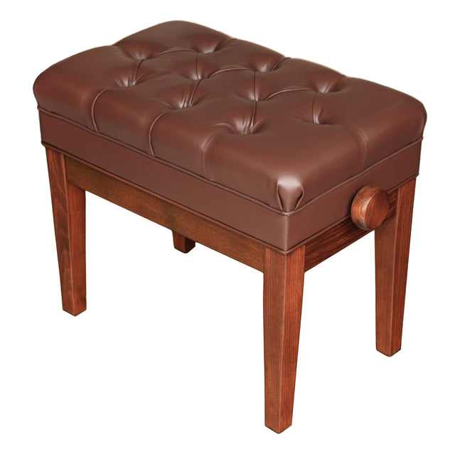 An imported bench measuring 22" x 14", and adjusting in height from 19" to 21.5", this adjustable piano bench comes with a music storage department. The tufted padding is plush and comfortable. Made of 100% hardwood, the adjustment knobs are finished to match the wood frame. The attractive square tapered legs are lined with padded rubber on the bottom, to protect your floor from damage.