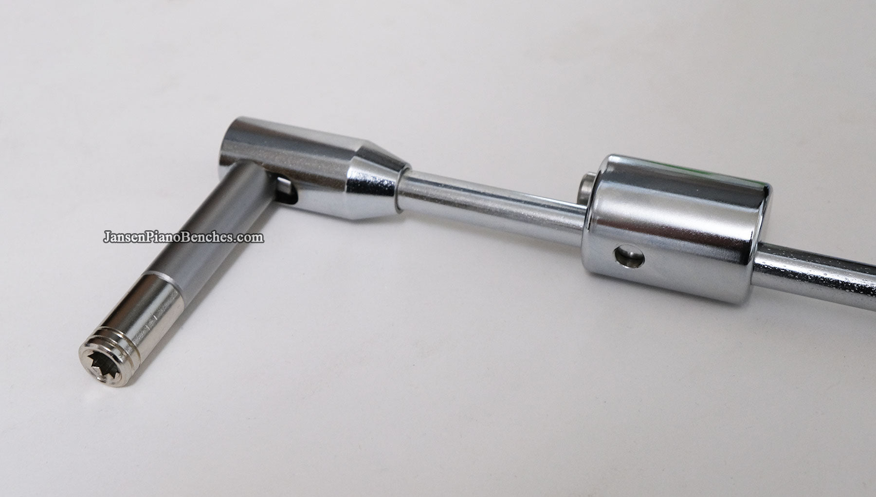 The tool uses a star end tip, which fits square heads. Using a star shaped design over the square design, allows the user to access the piano pins from different angles.