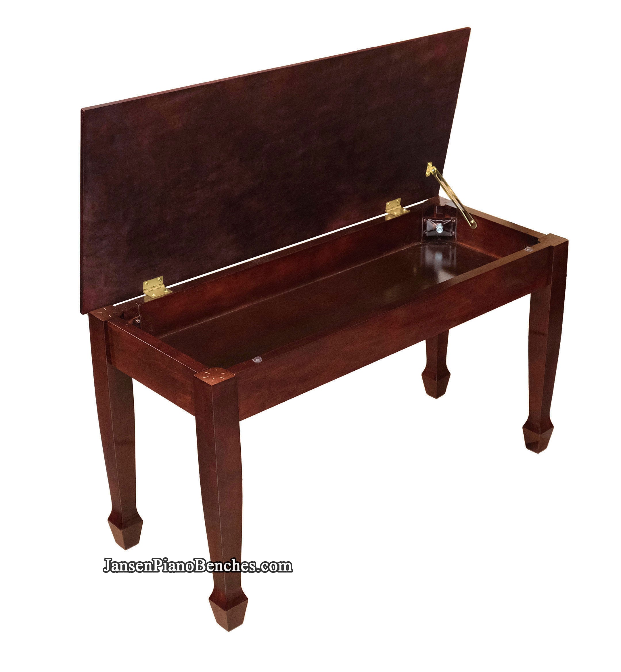 Supported with heavy duty brass hardware, the Jansen grand piano bench features a routed in music compartment--compared to most of the foreign imported benches, which only staple in their music compartments. By doing this, the wood bottom not only offers a sturdy surface for the heaviest music books, it also acts as structural reinforcement for the entire bench. The depth of the sheet music storage area is 2-3/4".