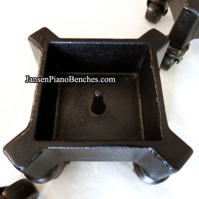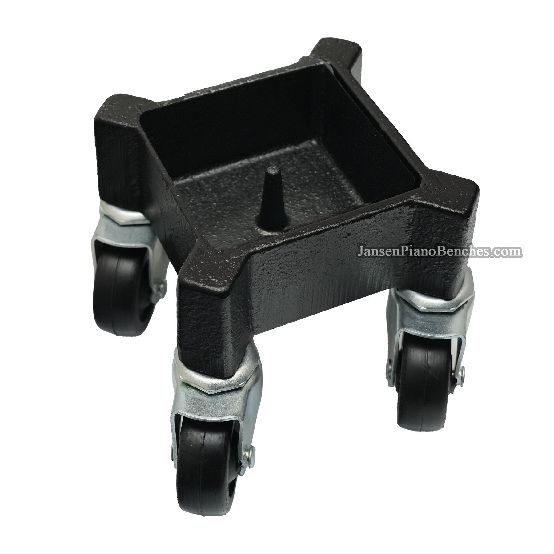 These Jansen grand piano leg dollies are manufactured in the United States, and are designed to be put under each grand piano leg. Cast iron with three ball bearing, Polyflex casters. Quickly mounted to grand leg with a standard socket. Spring-mounted spindle to allow for movement over rugs or high spots. Available in a square leg (J4018-S) or round leg (J4018-R) model