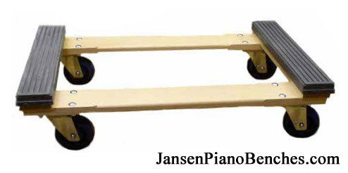 The Jansen Piano Moving Dolly is designed so that pianos and organs will not slide off the dolly. The rubber ends grip the piano, holding them securely to the dolly. Made of hardwood maple with mortised frame ends bolted together to keep the dolly square. Dolly has 4" swivel, non-marking, ball bearing, rubber wheels. Manufactured by Jansen.