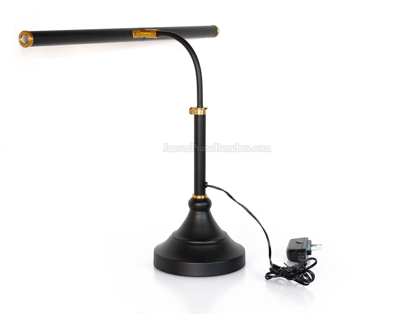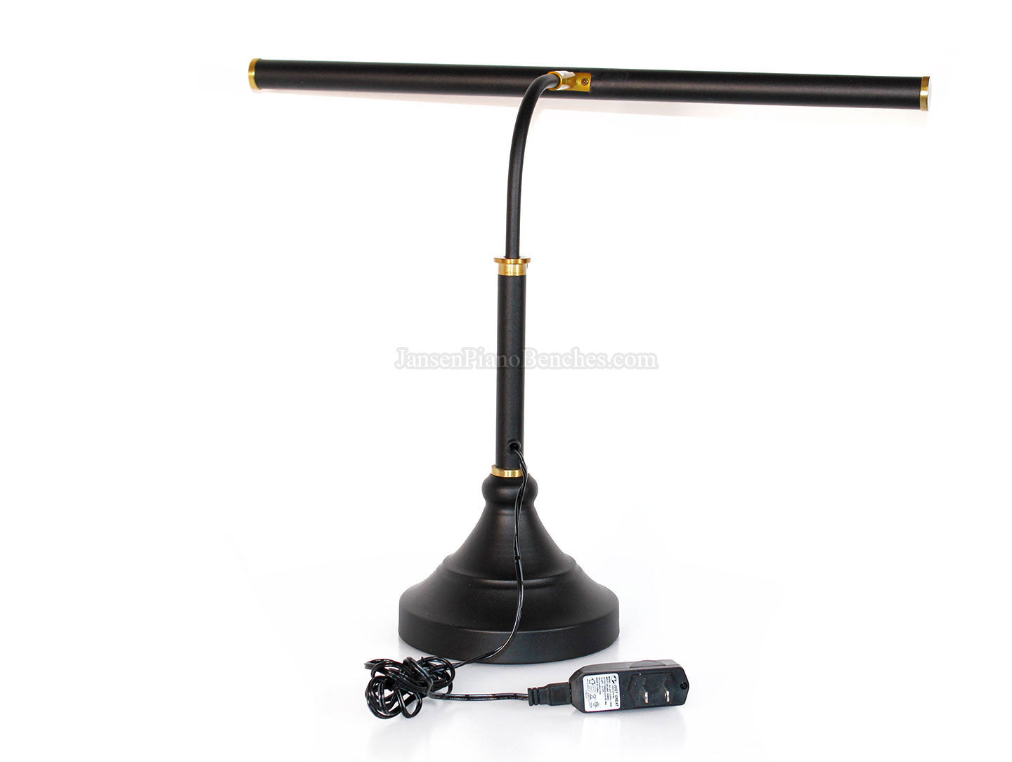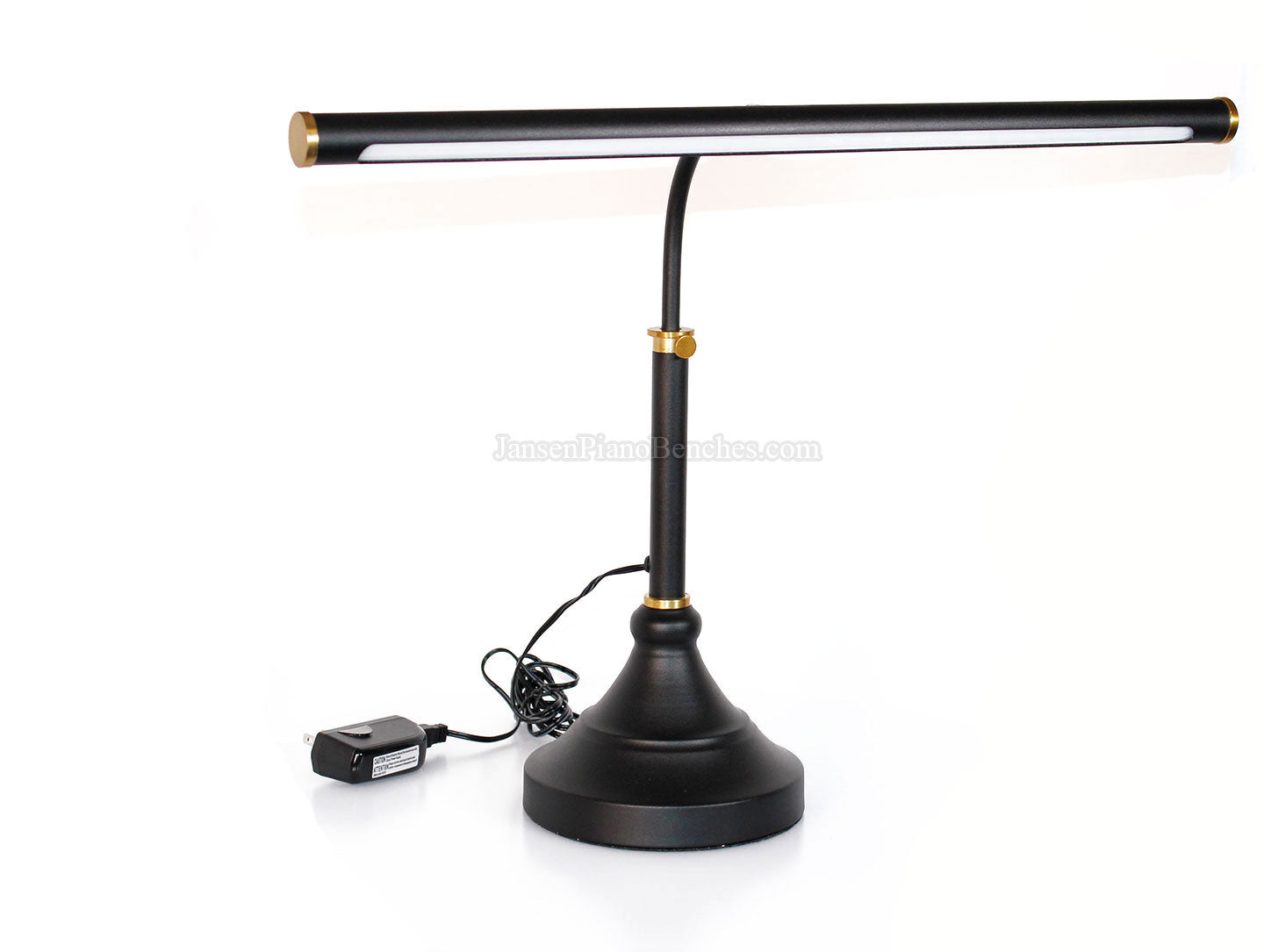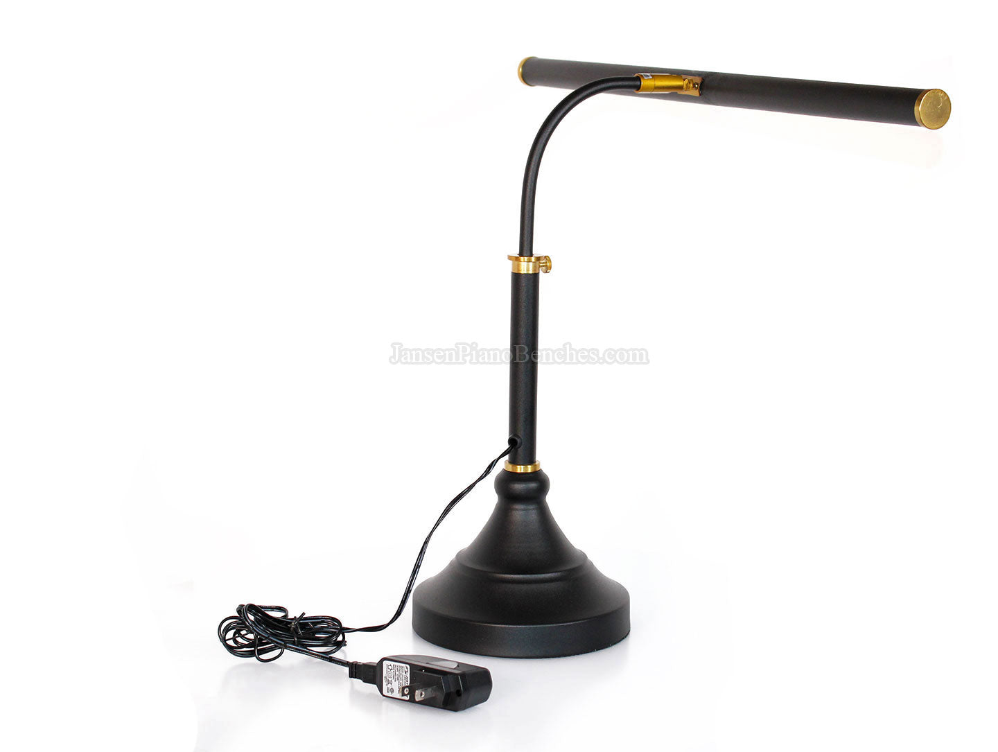 Luxurious LED piano lamp in a black satin finish with brass accents. Lamp adjusts in height from 13.75" to 16.5", and has a 19.5" wide light shade that swivels to provide optimal lighting (the lamp shade connects to the bar via a ball joint, so you can adjust it vertically and horizontally). Modern updated design, a unique feature of this lamp is that it has 3 brightness options, all controlled by the touch-button on the right side of the lamp shade. A complaint seen on many lamps is the on/off switch is located far down the cord, making it a bit difficult to reach as it's draped over the side of the piano. With this lamp, simply tap the button to turn it on and off. The LED lighting is a soft warm light, rated at 5 Watts and 3000k. The piano light plugs into your electrical outlet--it is not battery operated.
