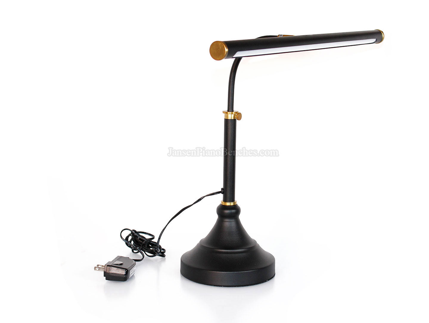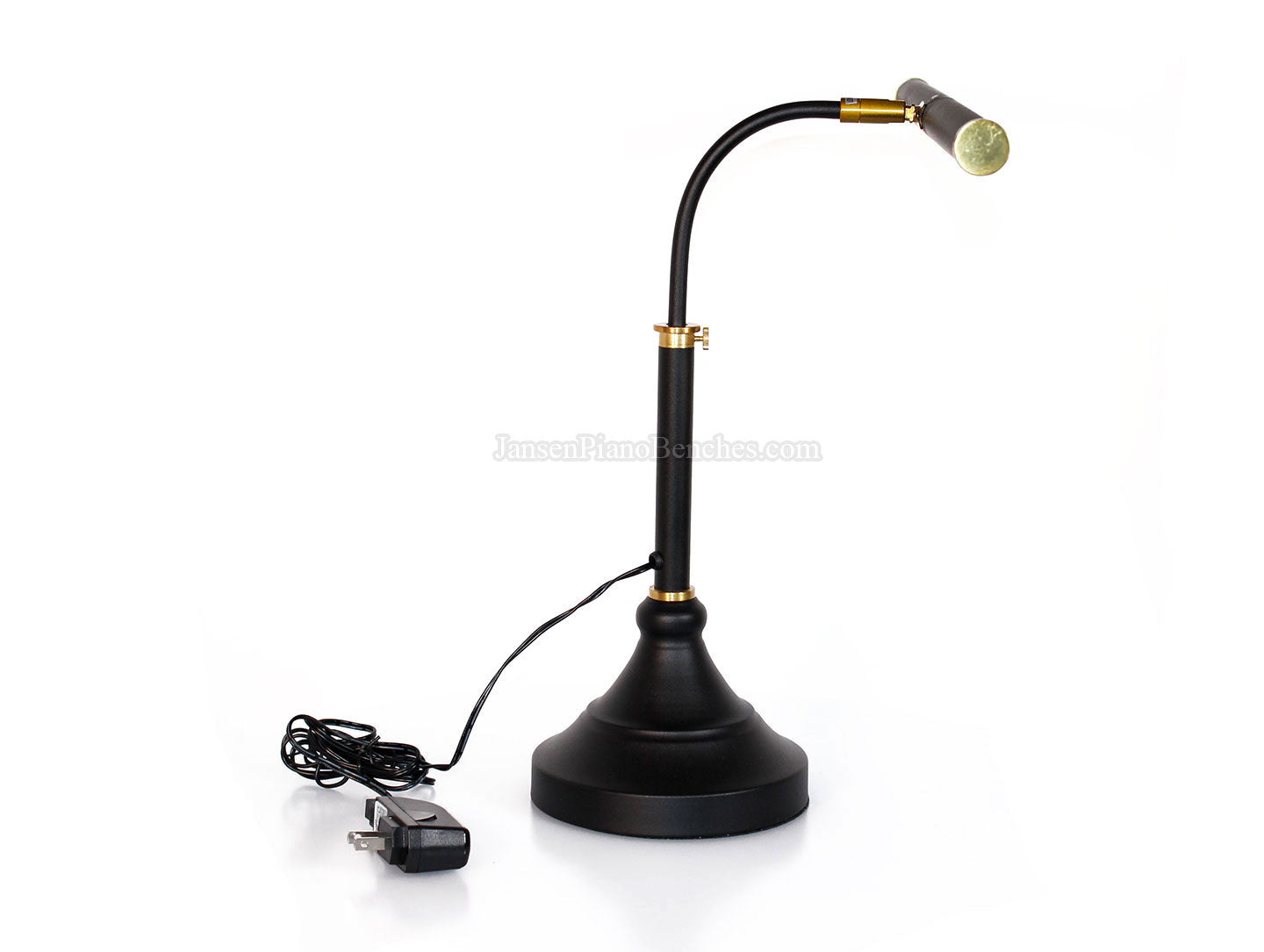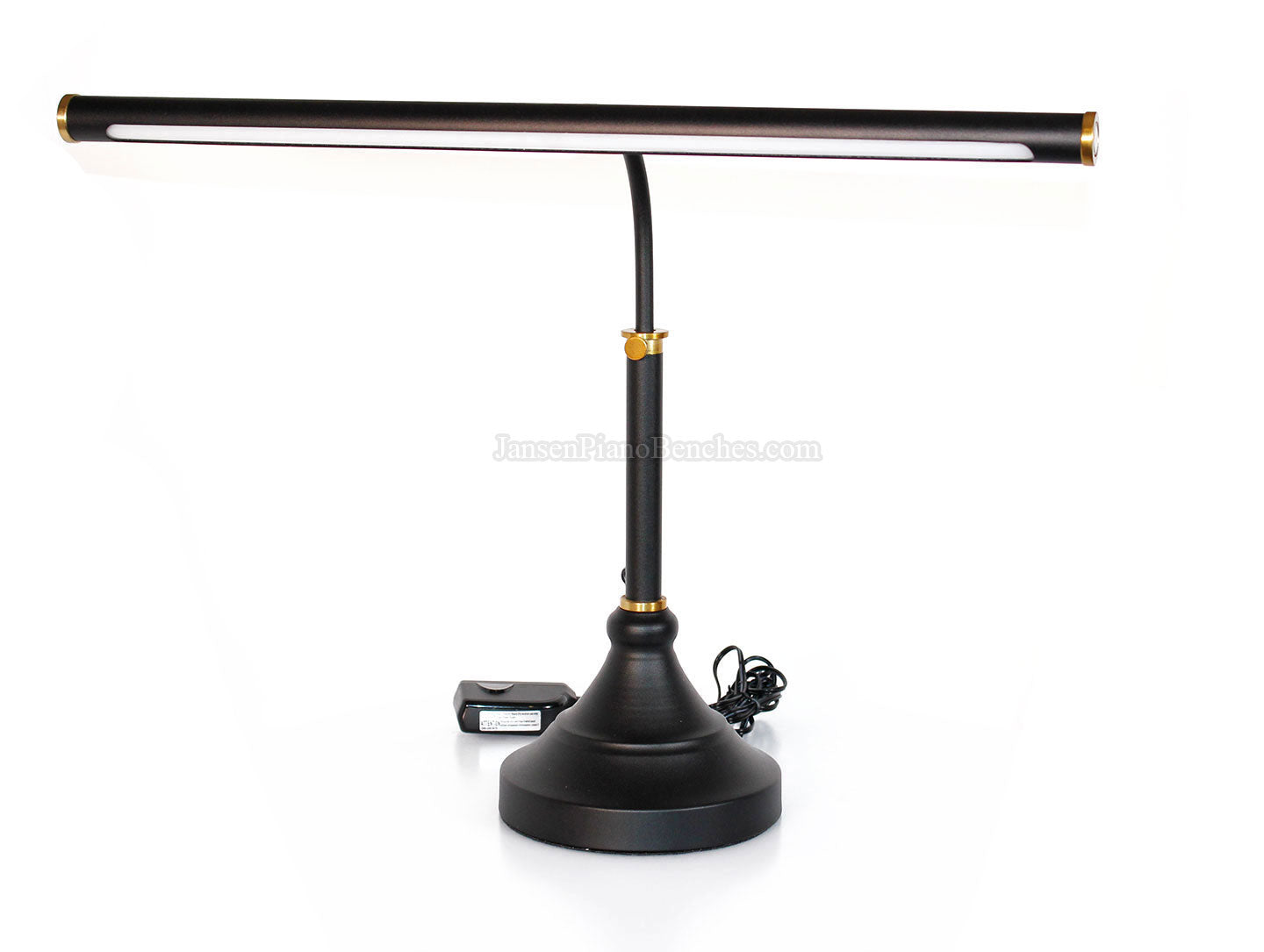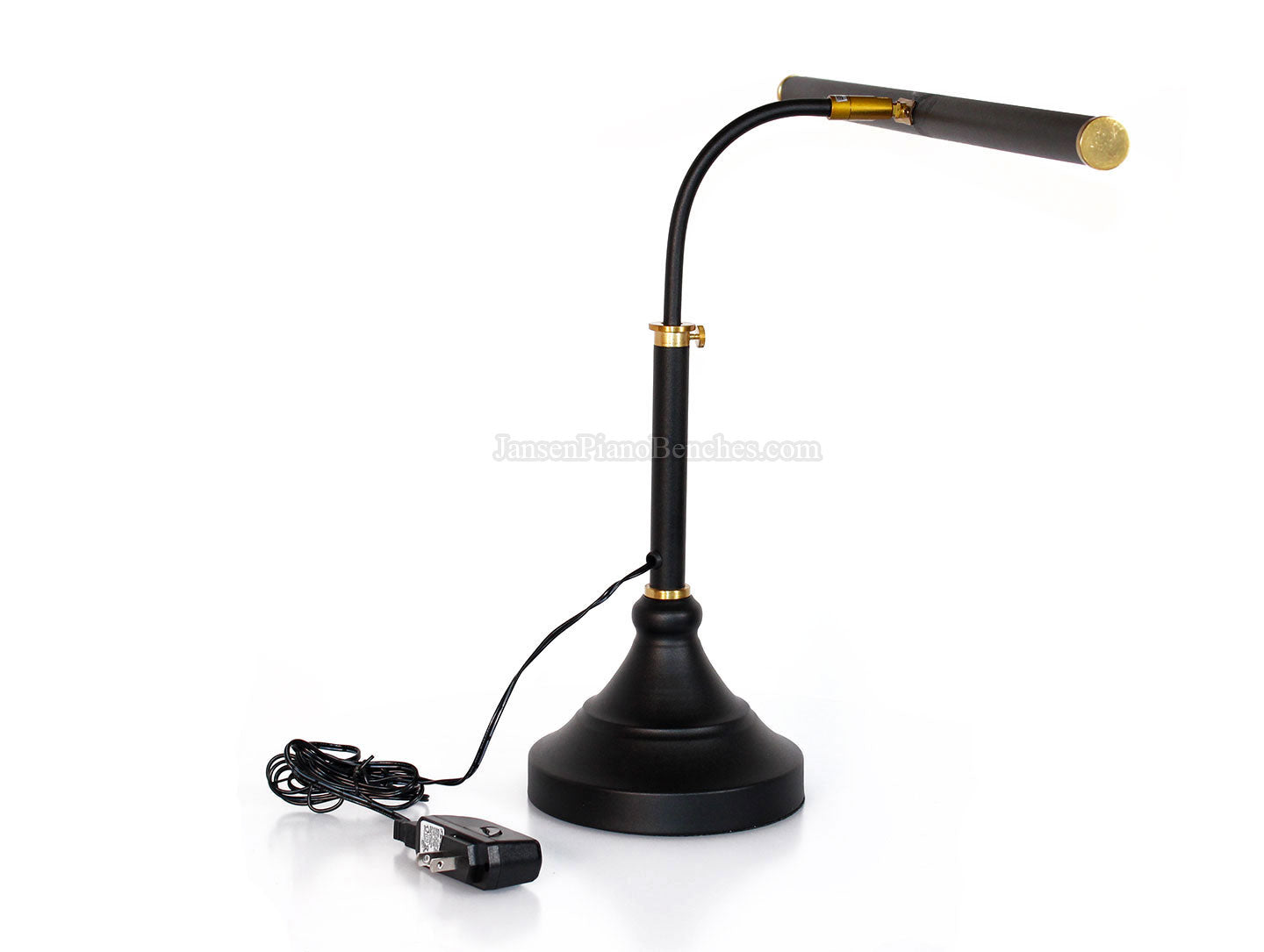 Luxurious LED piano lamp in a black satin finish with brass accents. Lamp adjusts in height from 13.75" to 16.5", and has a 19.5" wide light shade that swivels to provide optimal lighting (the lamp shade connects to the bar via a ball joint, so you can adjust it vertically and horizontally). Modern updated design, a unique feature of this lamp is that it has 3 brightness options, all controlled by the touch-button on the right side of the lamp shade. A complaint seen on many lamps is the on/off switch is located far down the cord, making it a bit difficult to reach as it's draped over the side of the piano. With this lamp, simply tap the button to turn it on and off. The LED lighting is a soft warm light, rated at 5 Watts and 3000k. The piano light plugs into your electrical outlet--it is not battery operated.