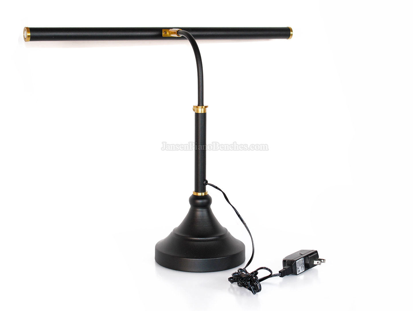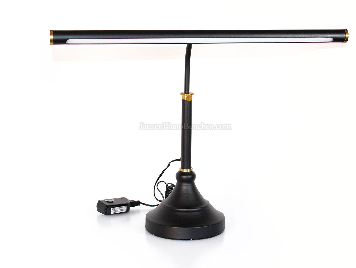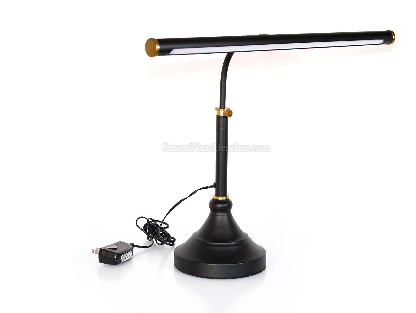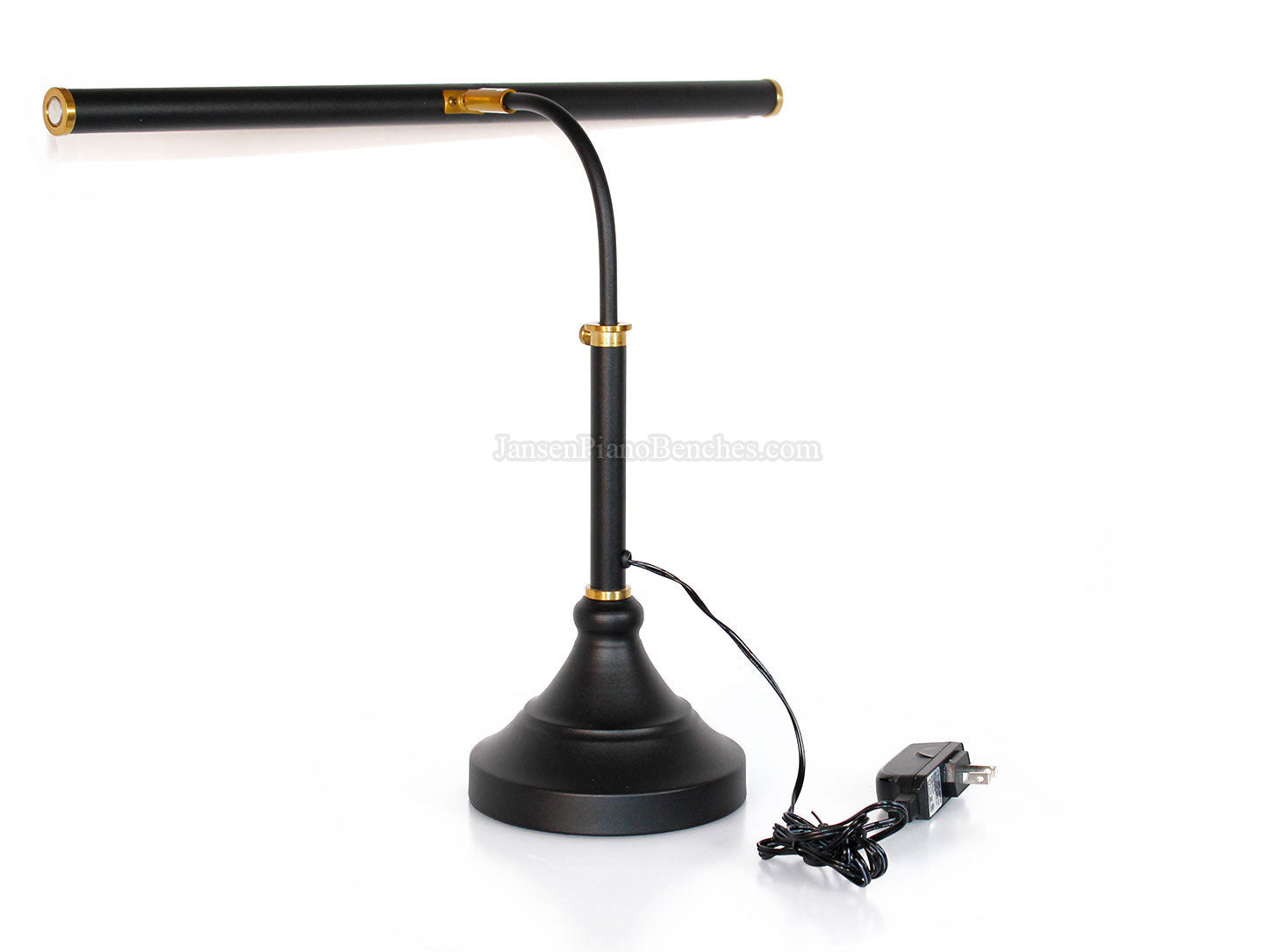 Luxurious LED piano lamp in a black satin finish with brass accents. Lamp adjusts in height from 13.75" to 16.5", and has a 19.5" wide light shade that swivels to provide optimal lighting (the lamp shade connects to the bar via a ball joint, so you can adjust it vertically and horizontally). Modern updated design, a unique feature of this lamp is that it has 3 brightness options, all controlled by the touch-button on the right side of the lamp shade. A complaint seen on many lamps is the on/off switch is located far down the cord, making it a bit difficult to reach as it's draped over the side of the piano. With this lamp, simply tap the button to turn it on and off. The LED lighting is a soft warm light, rated at 5 Watts and 3000k. The piano light plugs into your electrical outlet--it is not battery operated.