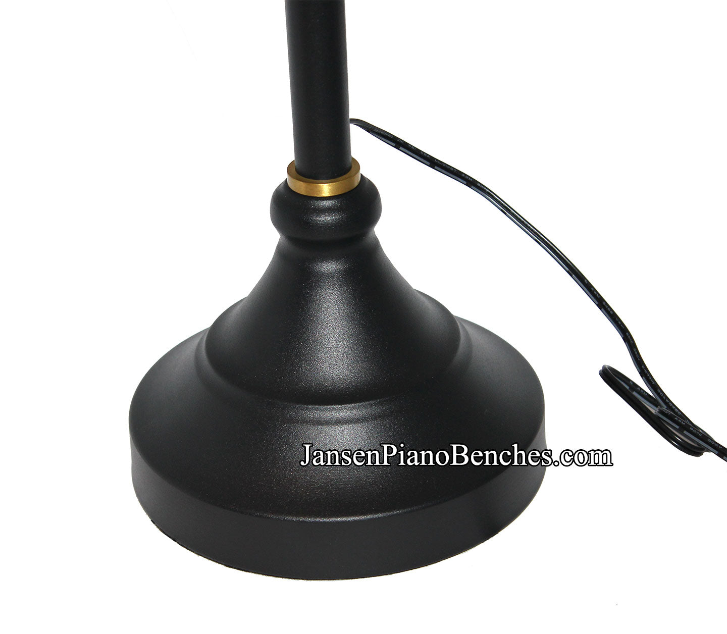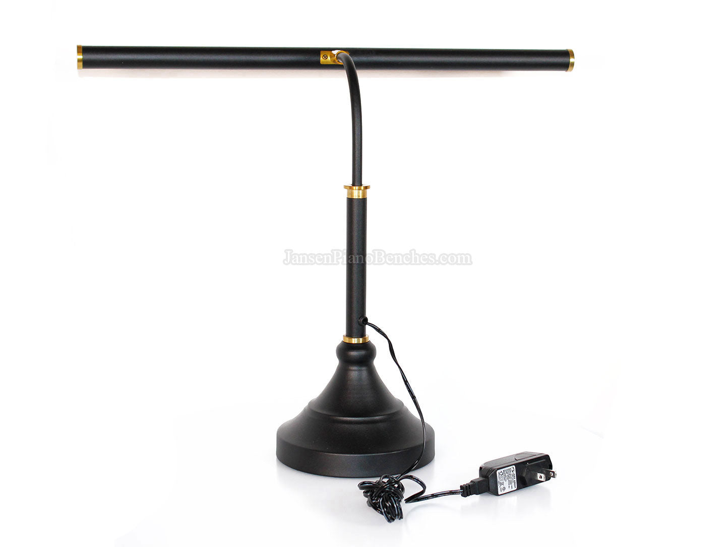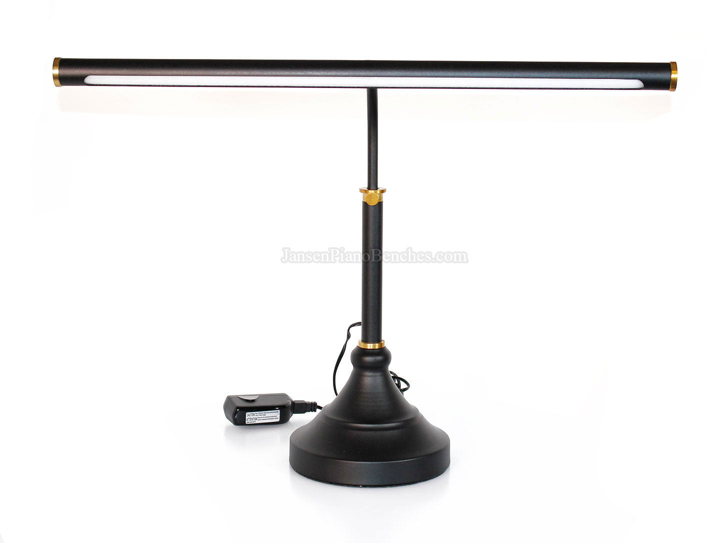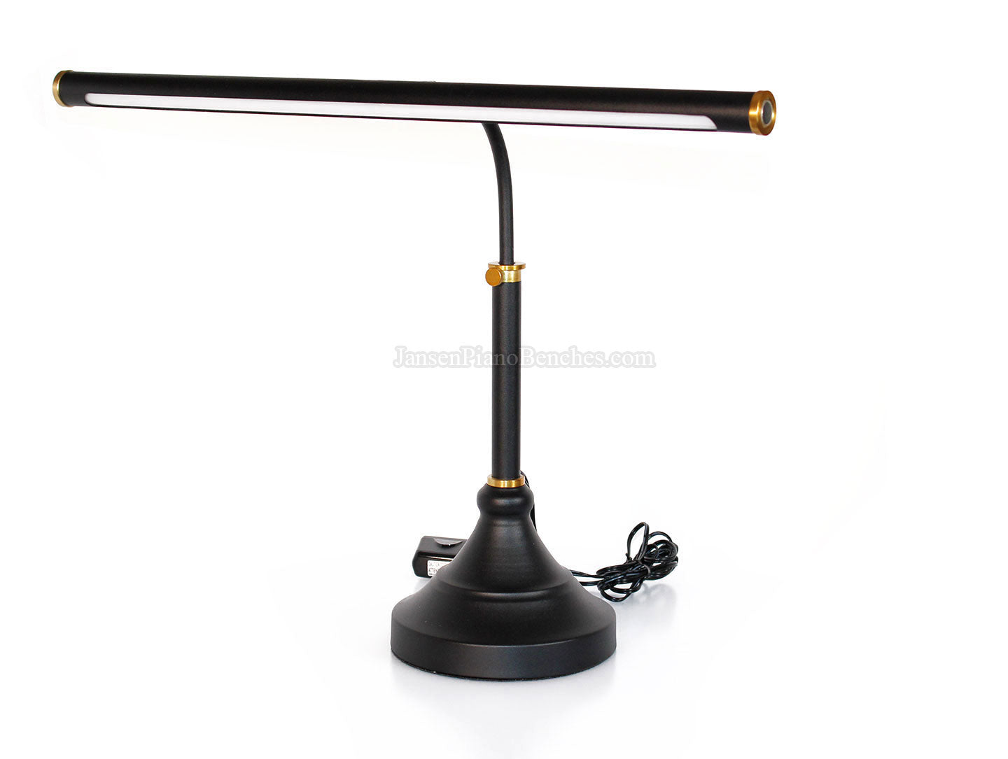 Luxurious LED piano lamp in a black satin finish with brass accents. Lamp adjusts in height from 13.75" to 16.5", and has a 19.5" wide light shade that swivels to provide optimal lighting (the lamp shade connects to the bar via a ball joint, so you can adjust it vertically and horizontally). Modern updated design, a unique feature of this lamp is that it has 3 brightness options, all controlled by the touch-button on the right side of the lamp shade. A complaint seen on many lamps is the on/off switch is located far down the cord, making it a bit difficult to reach as it's draped over the side of the piano. With this lamp, simply tap the button to turn it on and off. The LED lighting is a soft warm light, rated at 5 Watts and 3000k. The piano light plugs into your electrical outlet--it is not battery operated.
