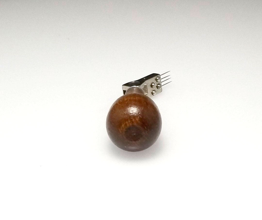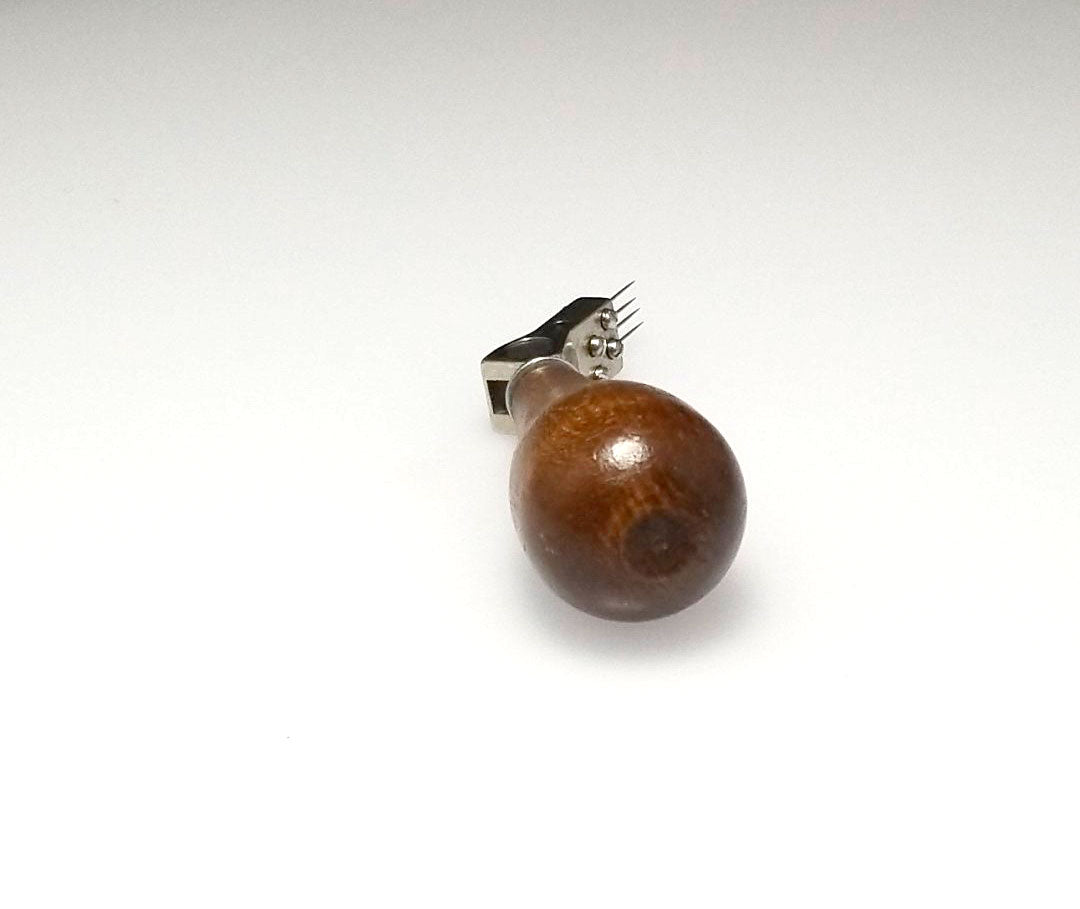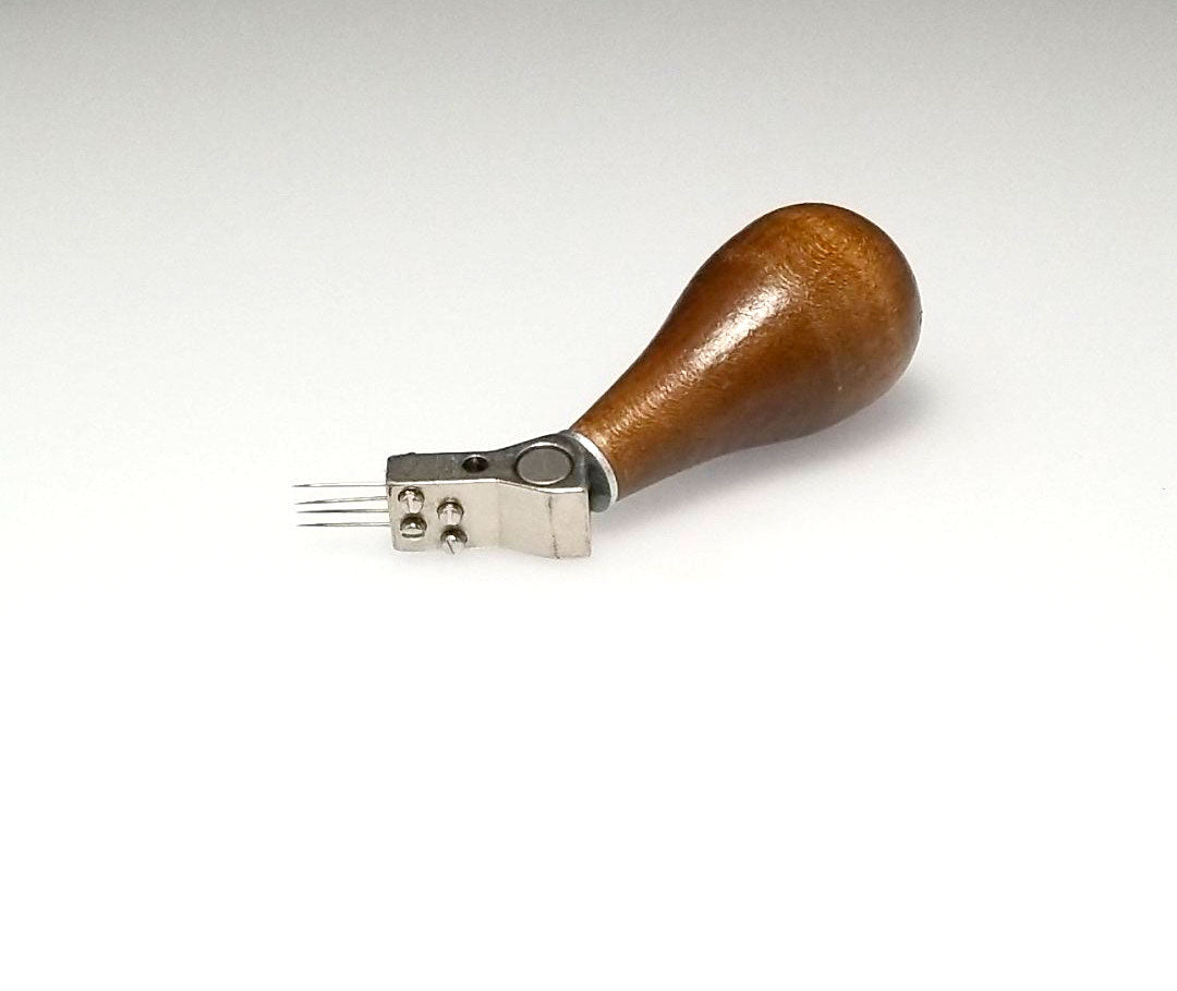 Adjustable Piano Hammer Voicing Tool with hardwood handle and 4 needle head. Head adjusts into 3 different positions. Each needle is held by an individual screw, and the needles are replaceable. Pear shaped hardwood handle, the metal is chrome plated. Overall length is 4.5 inches. High quality tool, manufactured in the United States.