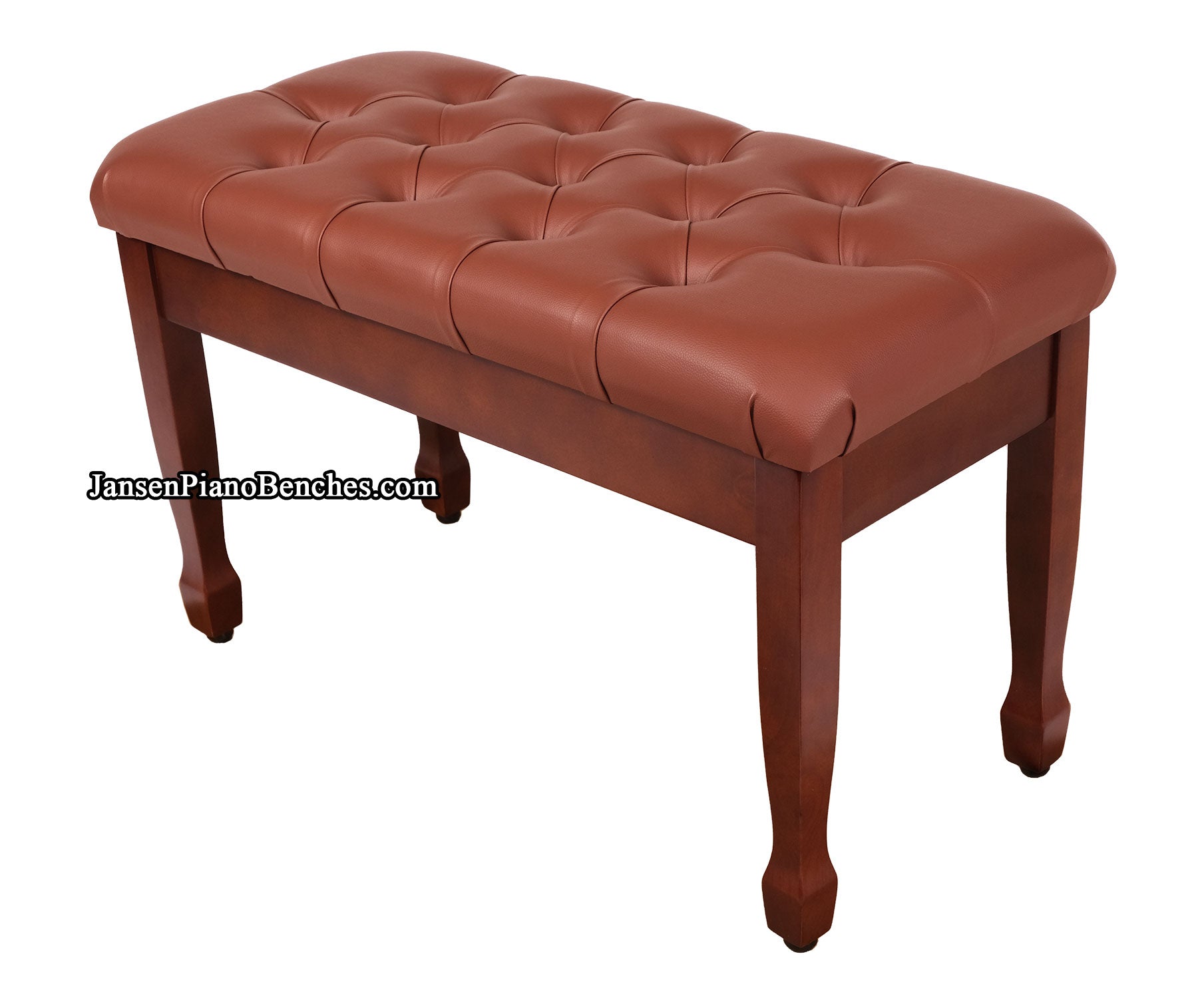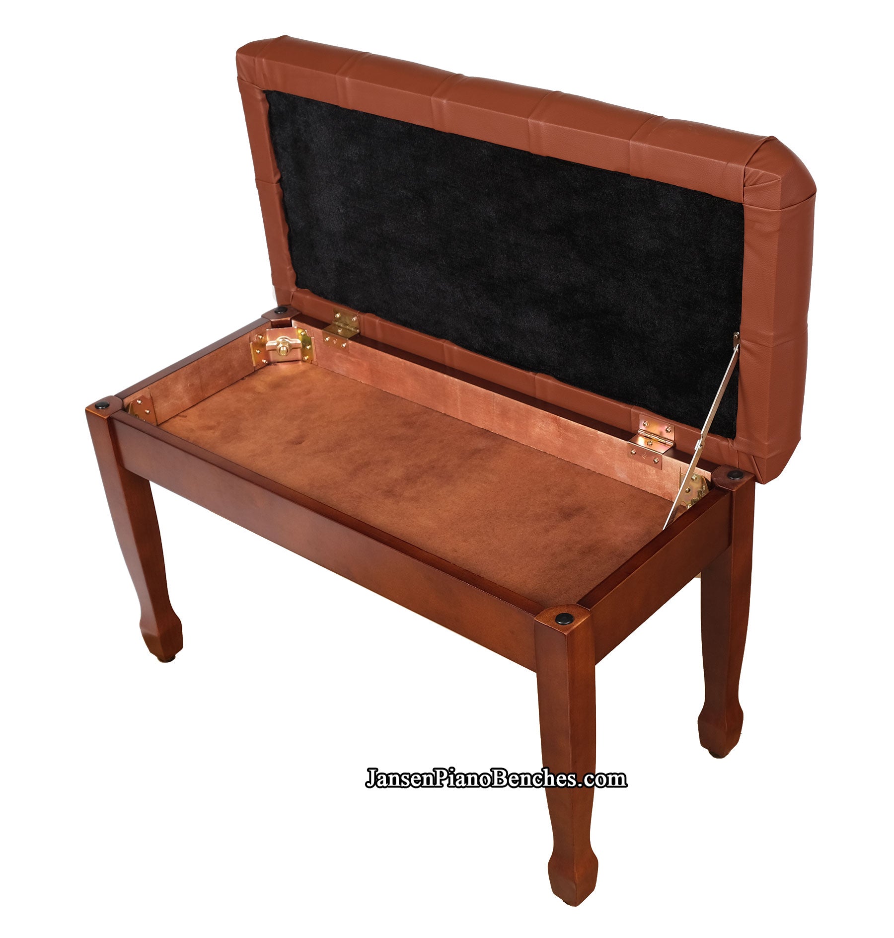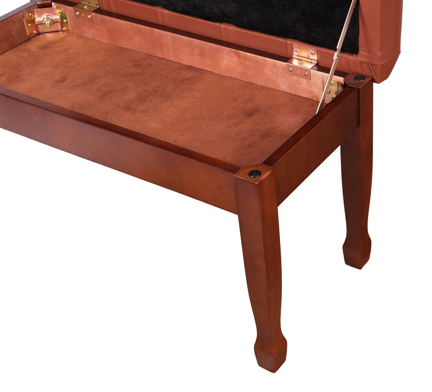 This hardwood piano bench uses the most popular leg style: spade legs. For added protection for your floors, the bottom of the legs have been equipped with rubber bumpers. While most benches have plastic tabs pushed into a hole in the bottom of the leg, these rubber bumpers are extra thick, and screwed into the bottom of the leg itself. Designed to last, these won't fall out of the bottom of your bench anytime soon. Additionally, these bumpers are adjustable (they screw in and out of the leg, so simply turn the bumper a bit to adjustable the height); if your floor is slightly uneven, you're able to adjust the bench to be level!