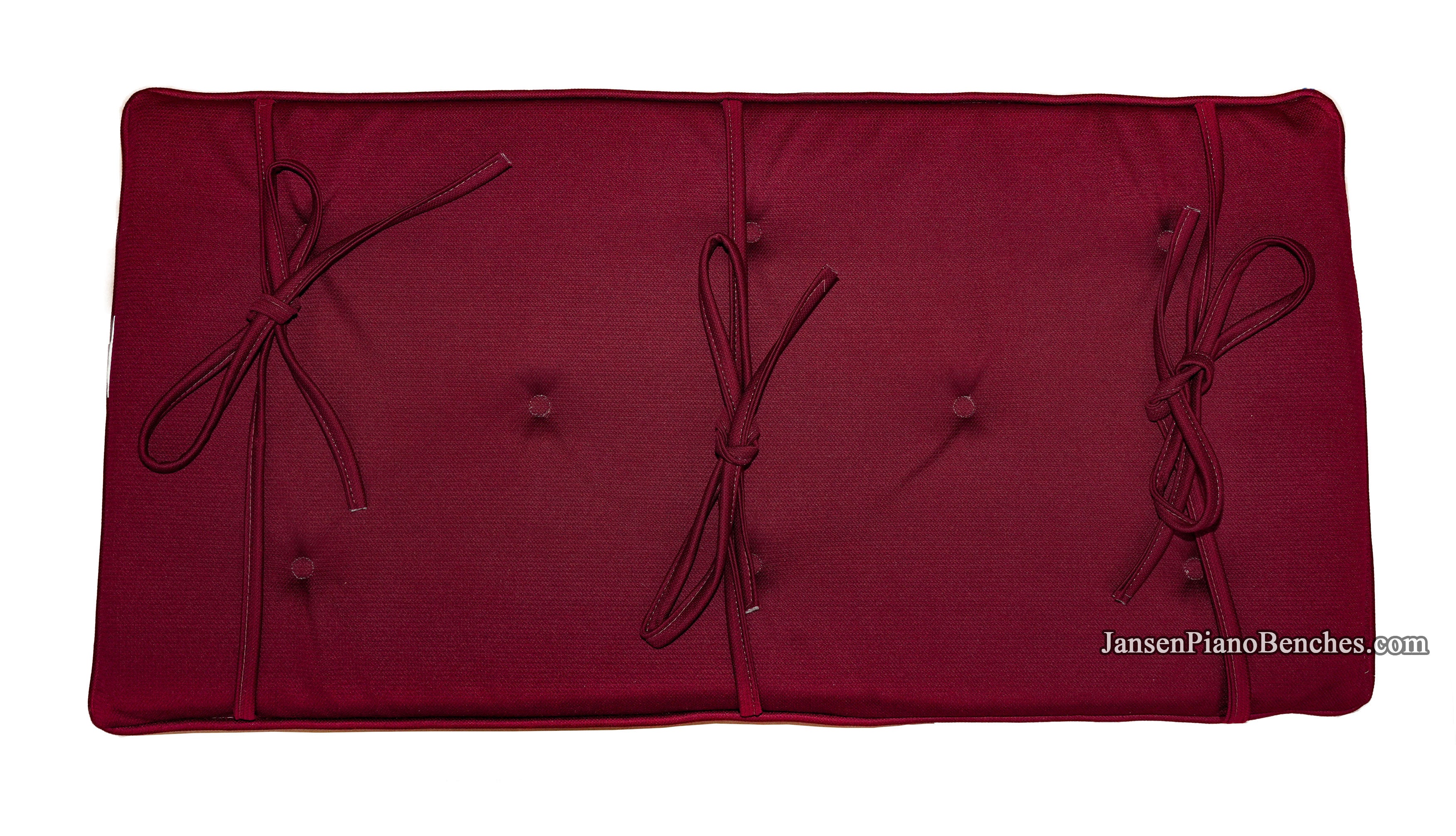 This burgundy merlot colored GRK piano bench cushion measures 30" x 14", and is 1" thick. Attaches to your piano bench via 3 sets of ties. High quality cushions, manufactured in the United States. Retails on our website for $143.00, we are offering $50.00 off on this cushion sale.