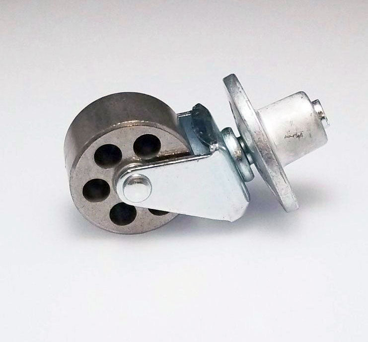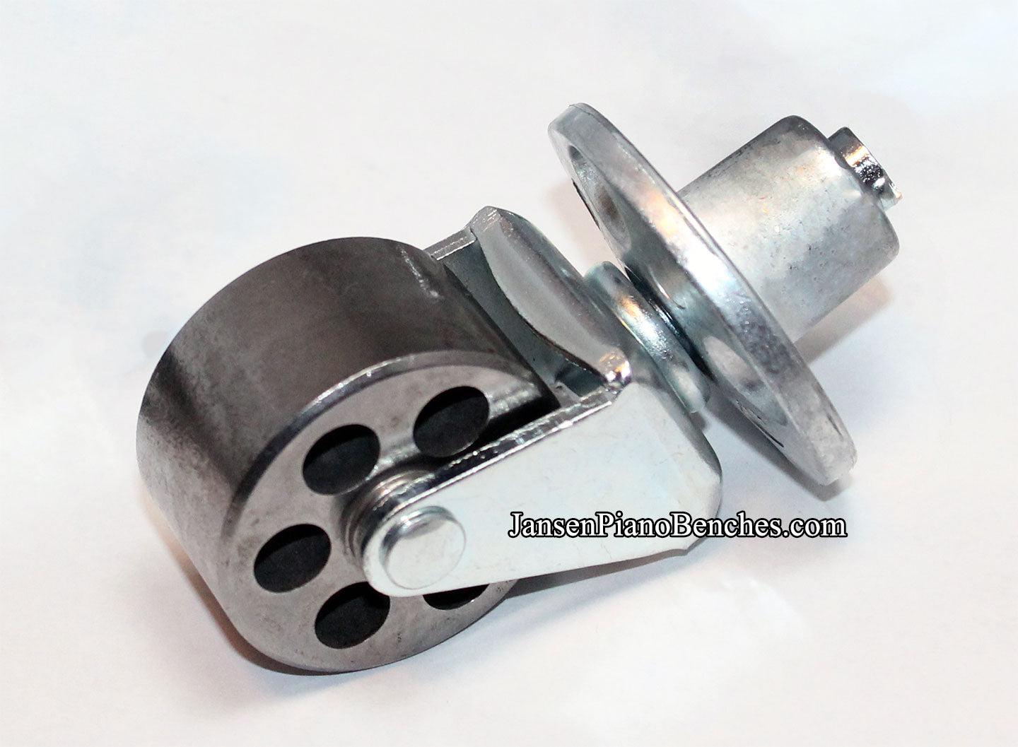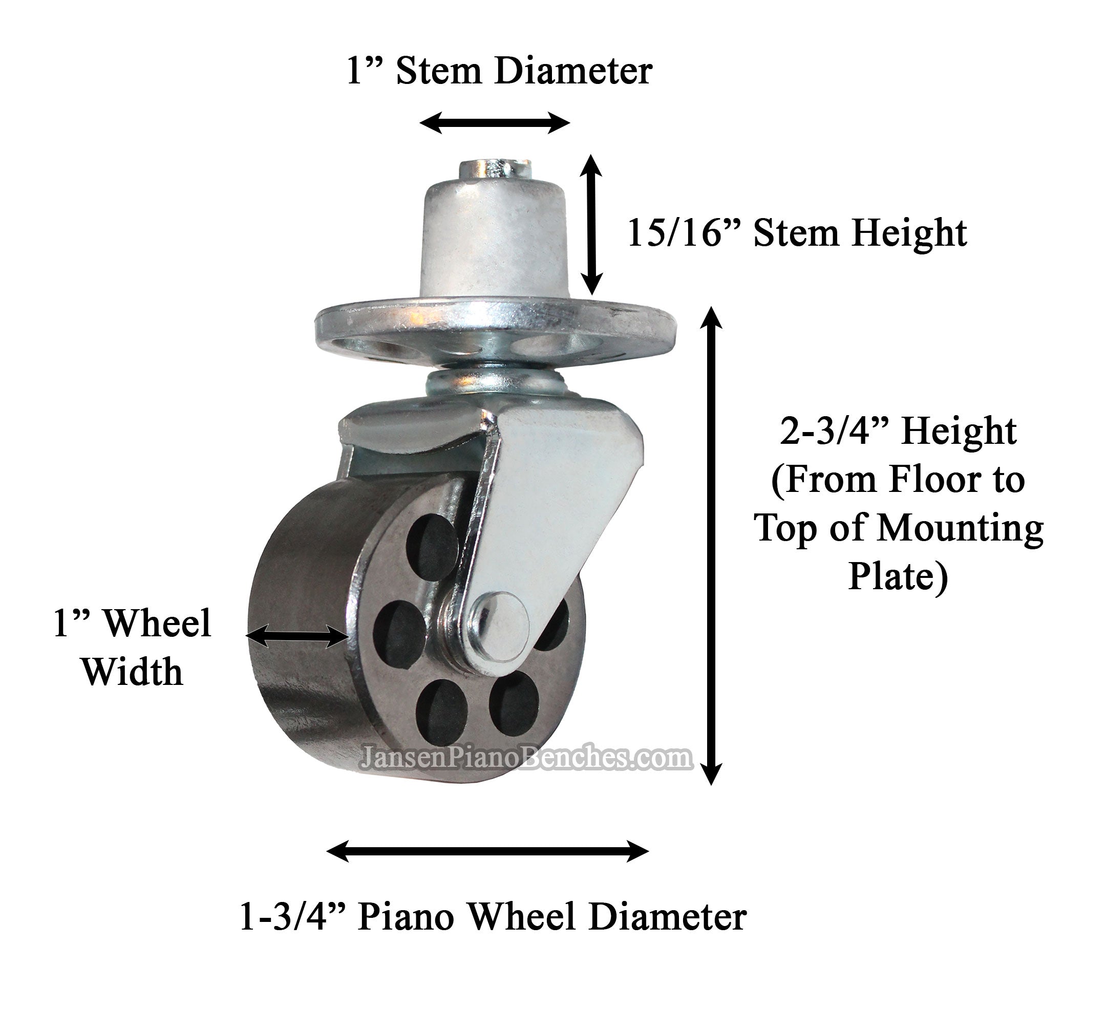 Heavy-duty cast iron upright piano wheels with built-in attached sockets, are ideal for heavy upright pianos (especially the extremely heavy uprights from the 1930s and earlier--where rubber wheels will not support the weight of the piano, or there is concern of the rubber breaking down over time). The wheel is 1" wide, and has a diameter of 1-3/4". The round mounting plates are 2-1/8" in diameter, and have four screw holes to attach to your piano. The stem (the part that goes into your piano), is 1" in diameter and 15/16" in height. Our most popular selling metal piano casters, manufactured in the United States.