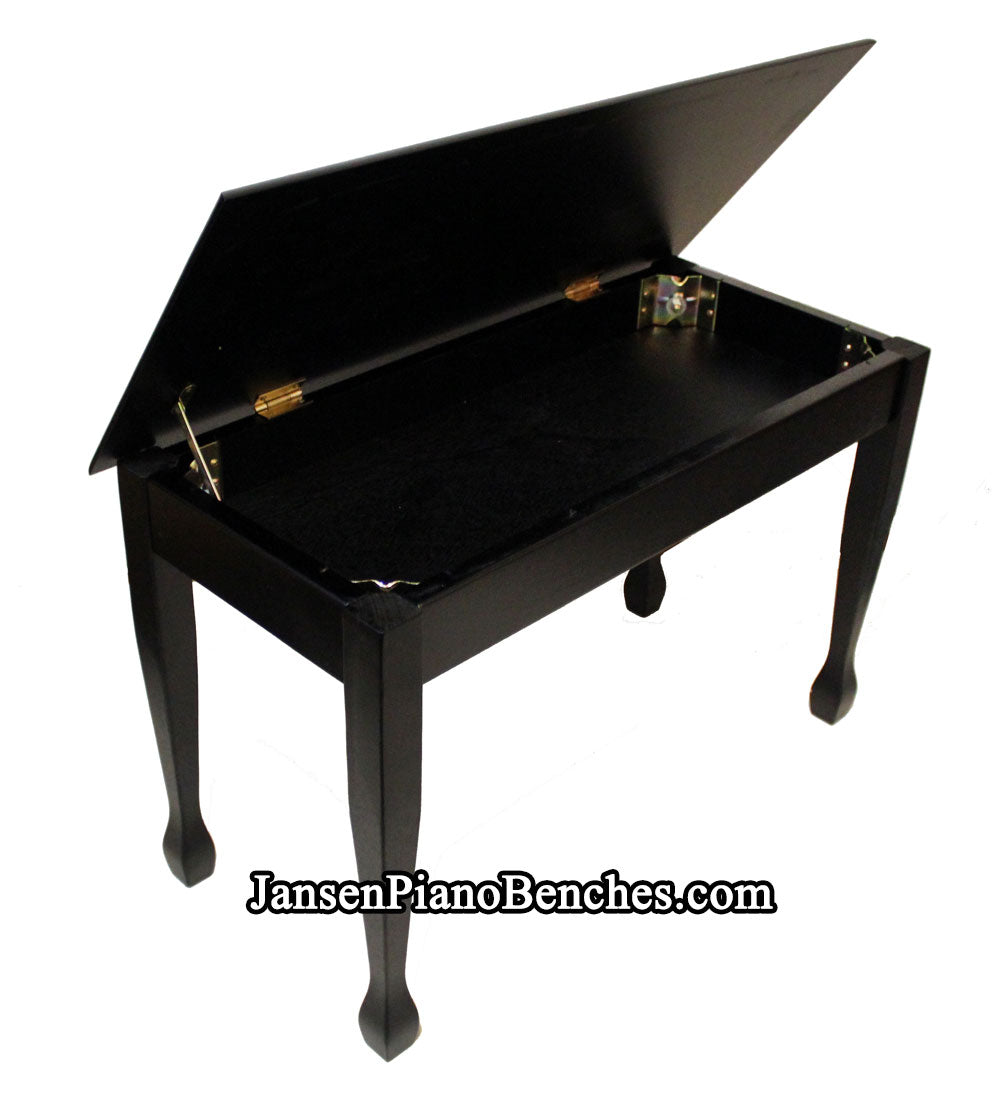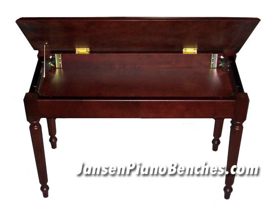 This imported piano bench is an attractive and sturdy piano bench constructed of solid wood, and a deep 2.5" music compartment for convenient storage of music, books and other small items. The tops are carefully veneered with genuine mahogany or walnut. All equipped with brass plated hinges and lid supports, and have full size music compartments.