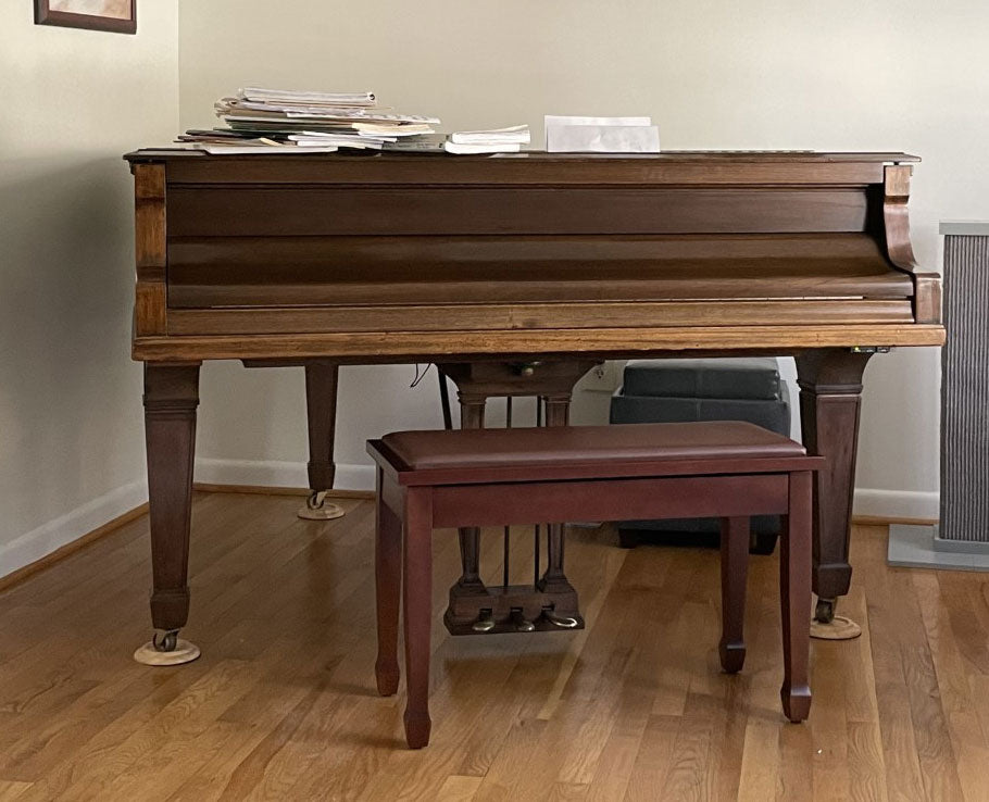 Listing is for a Yamaha style padded top piano bench, in a satin walnut finish, with spades legs. The bench is unused, and is a customer exchange, as it did not match their walnut piano as well as they would have liked--please note these walnut benches do have some red tones in the finish. Some mid-century American pianos are a much more flat brown without the reds, so it may not be a perfect match. You can view the second picture in the listing as an example, using a picture of this walnut bench compared to their flat brown walnut piano.