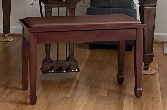 This imported Yamaha style piano bench is a high quality piano bench constructed with a solid wood frame and legs. The piano bench features a padded vinyl inset top with wood trim, a deep, routed-in music storage compartment, heavy duty brass hardware, and protective caps on the bottom of the piano legs to prevent damage to your floors.