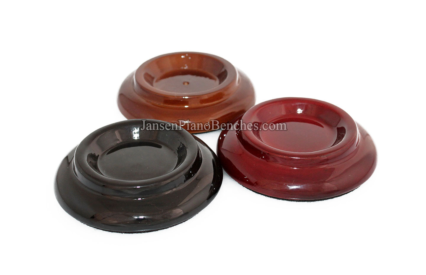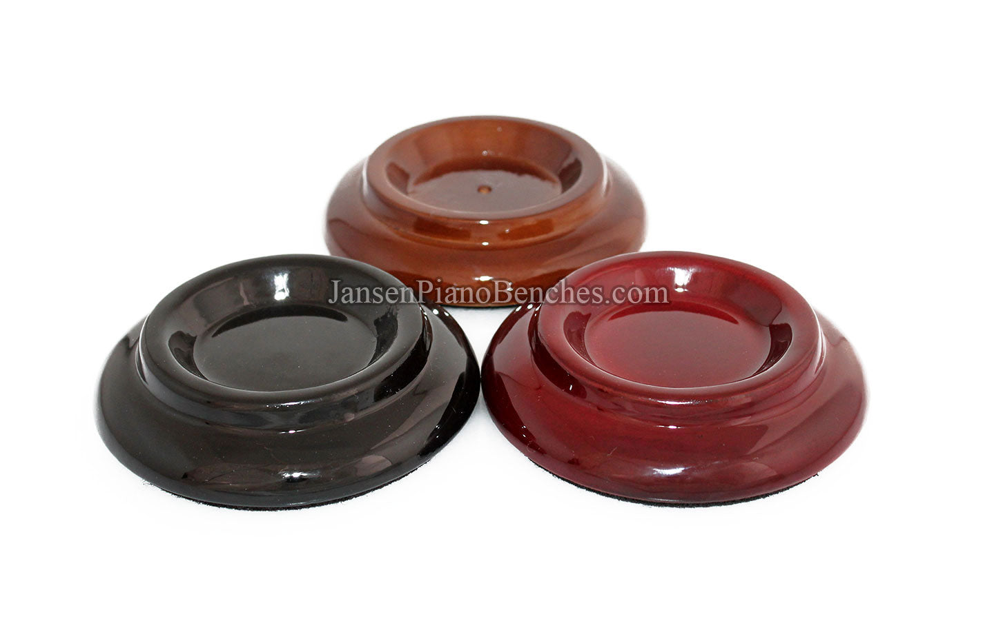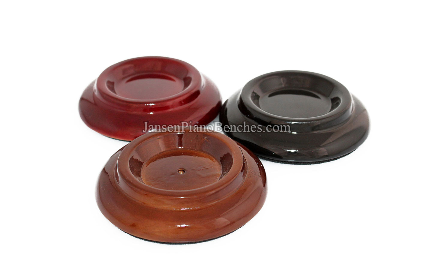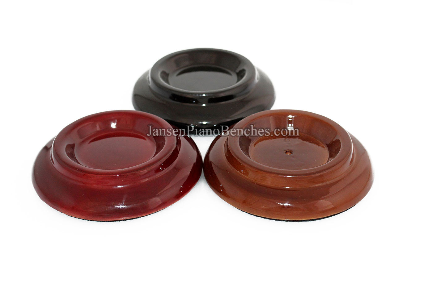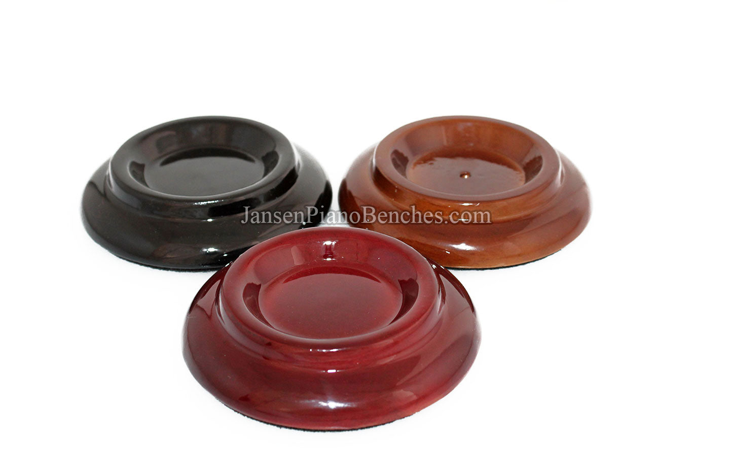 Finish Options: Available in Mahogany, Walnut, and Black finishes, in either a satin (matte) finish or high gloss finish, these caster cups come in the most popular piano finish options.