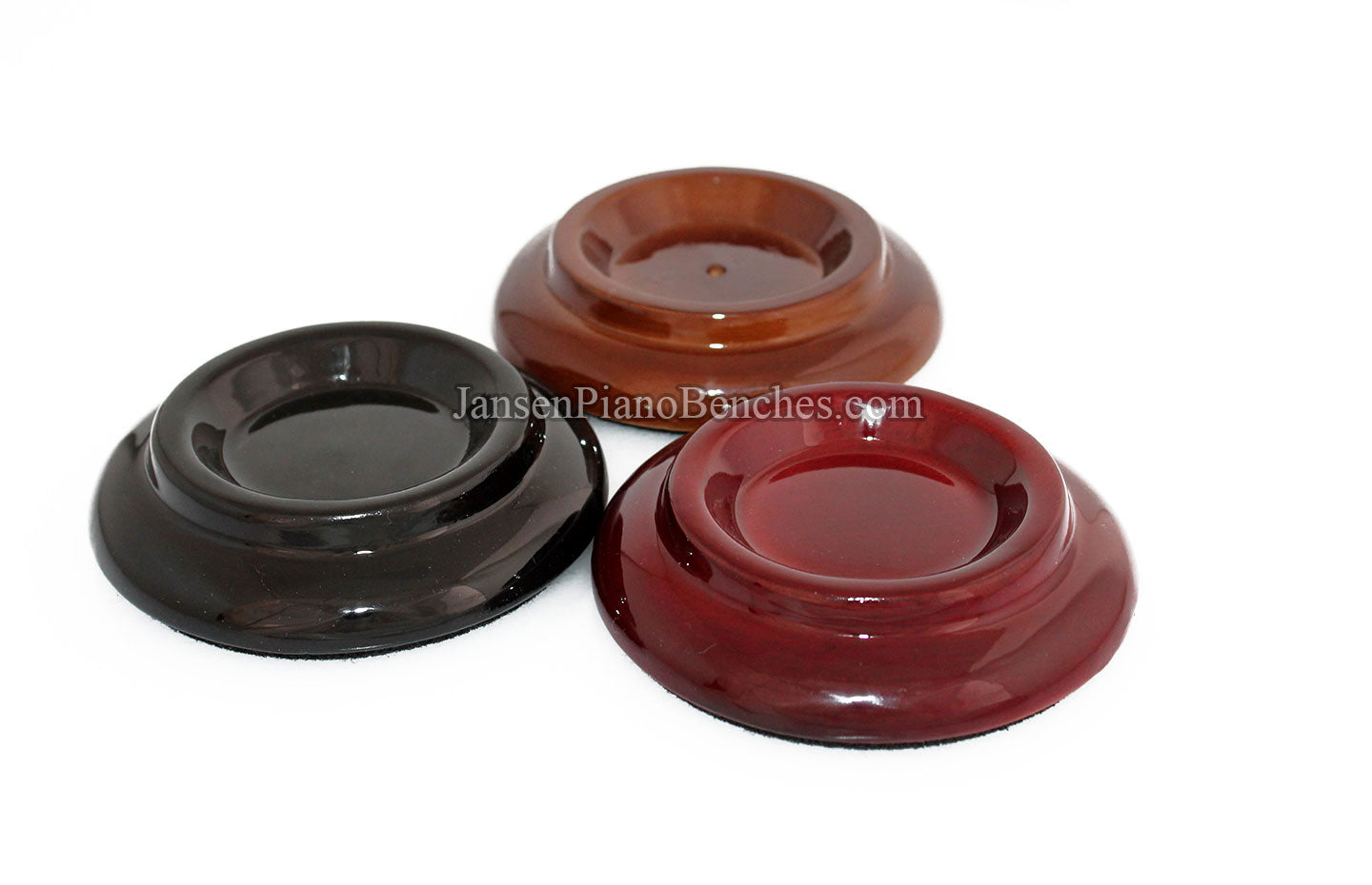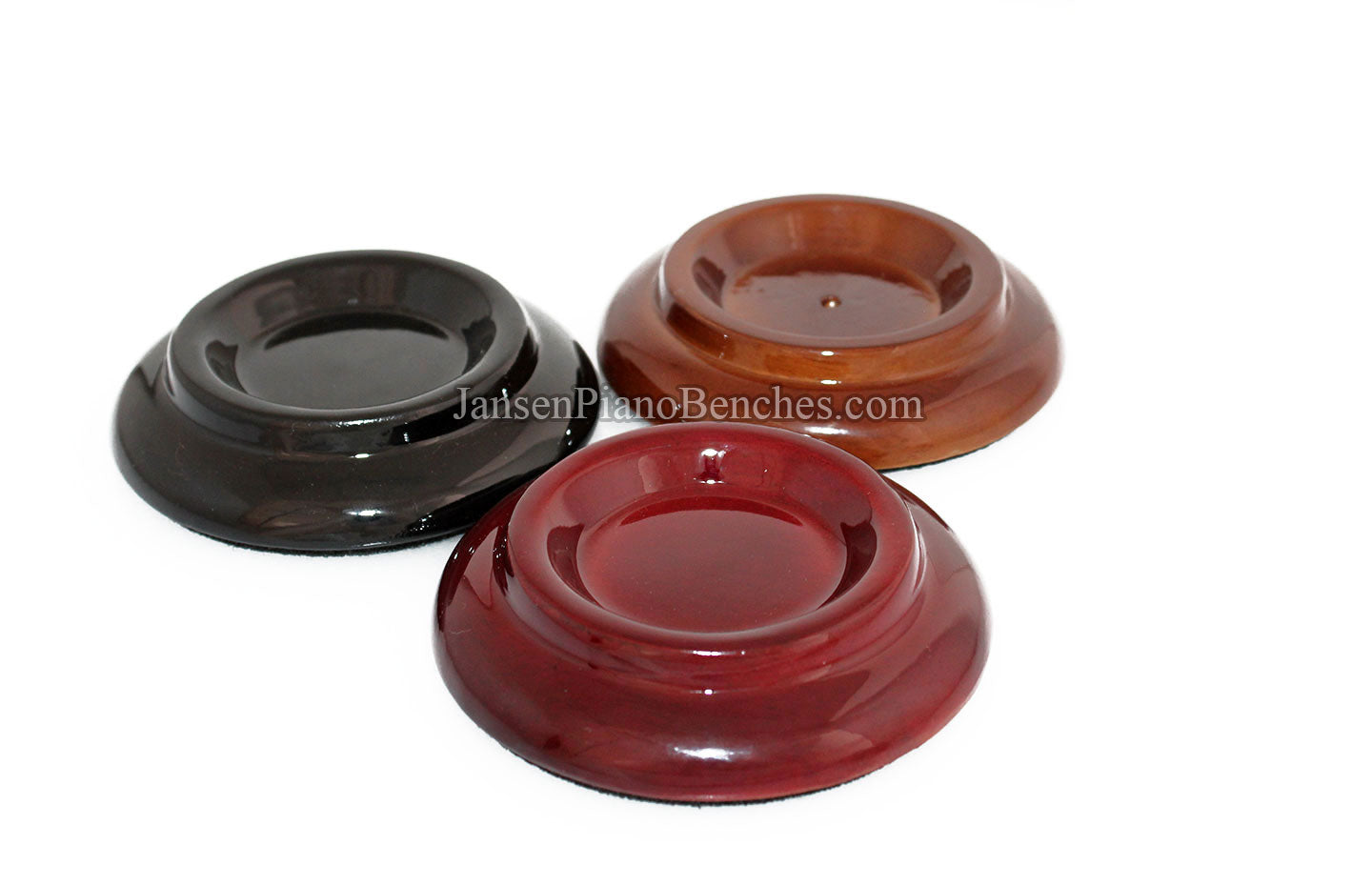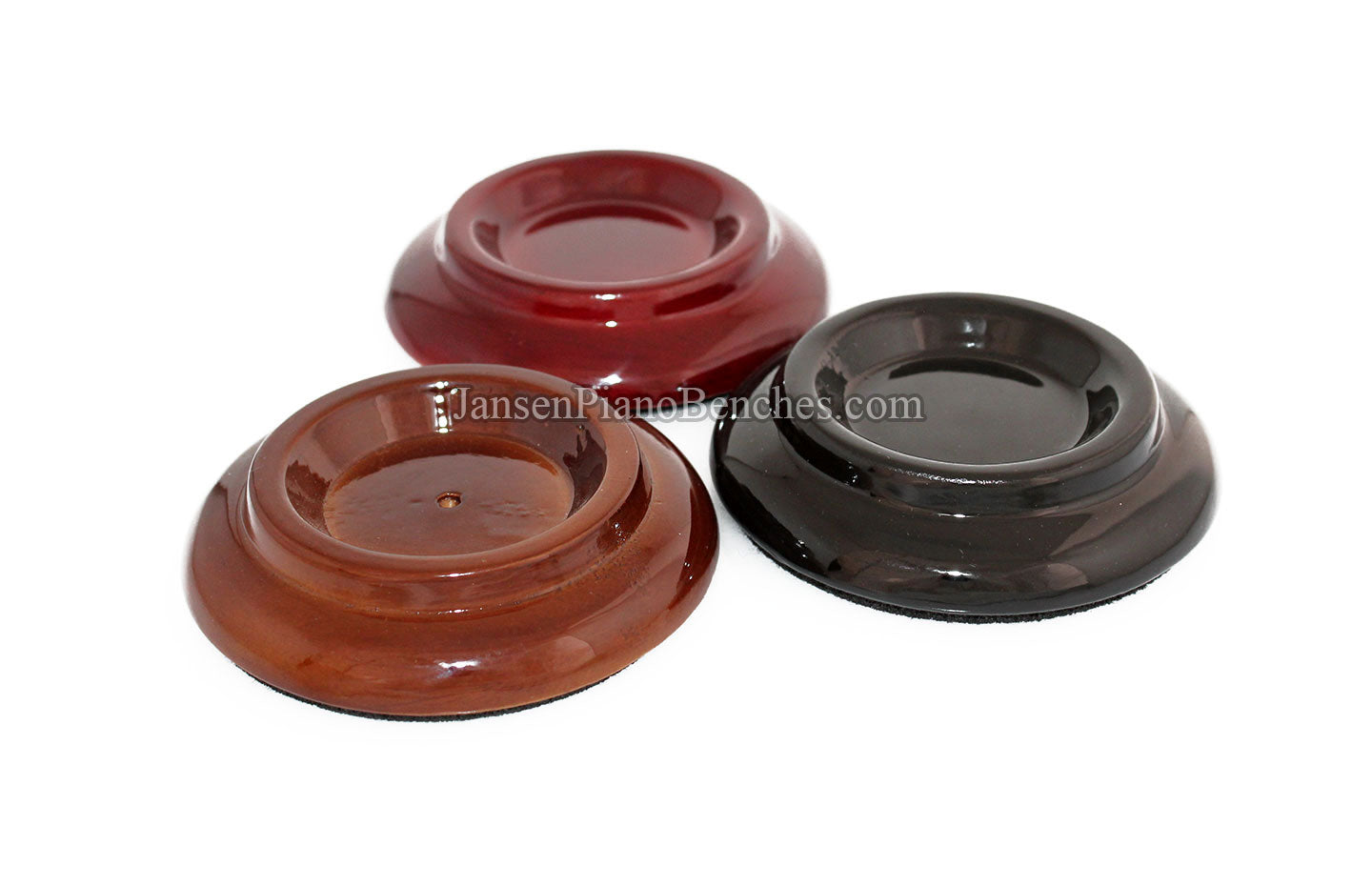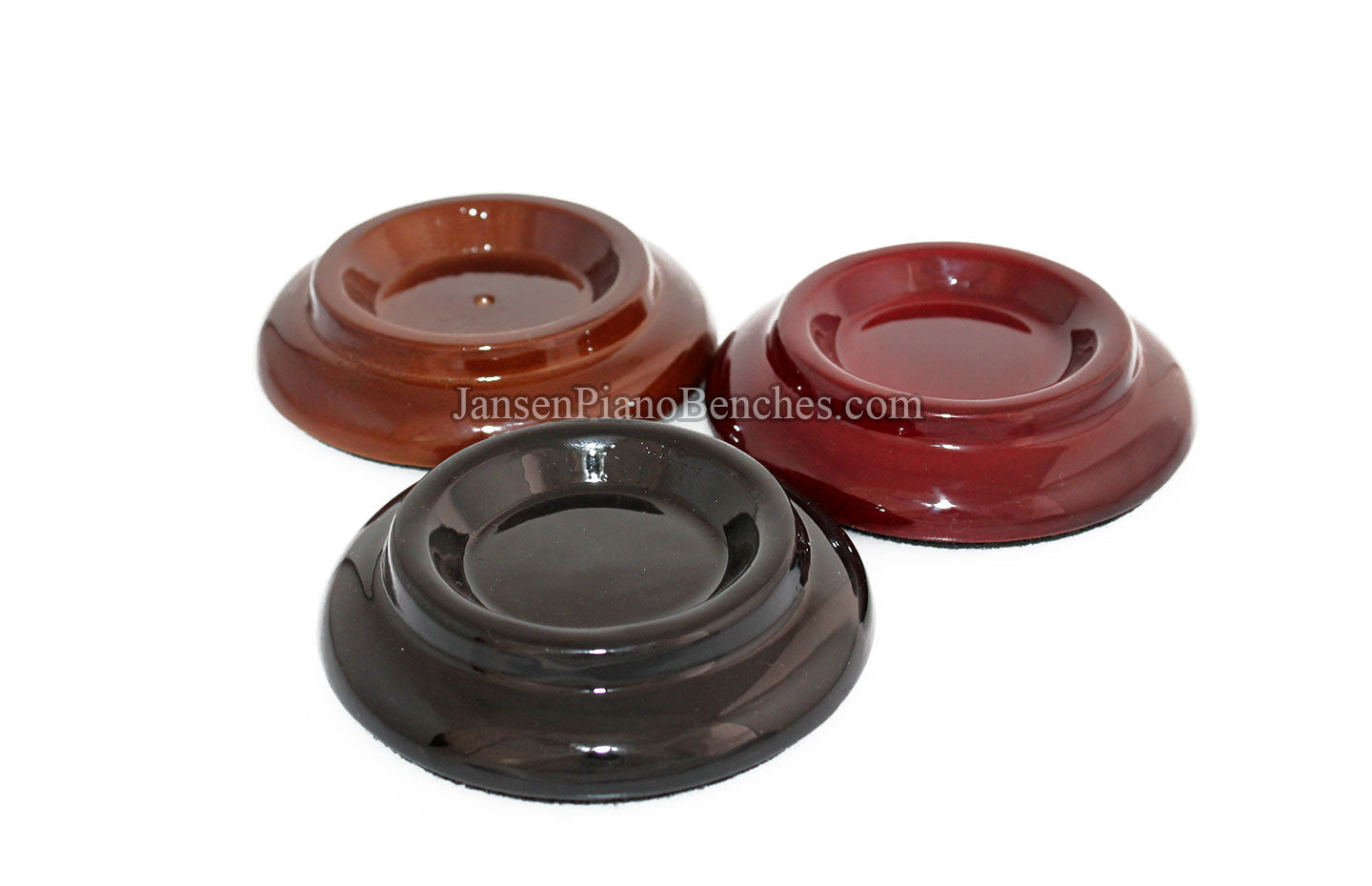 Finish Options: Available in Mahogany, Walnut, and Black finishes, in either a satin (matte) finish or high gloss finish, these caster cups come in the most popular piano finish options.