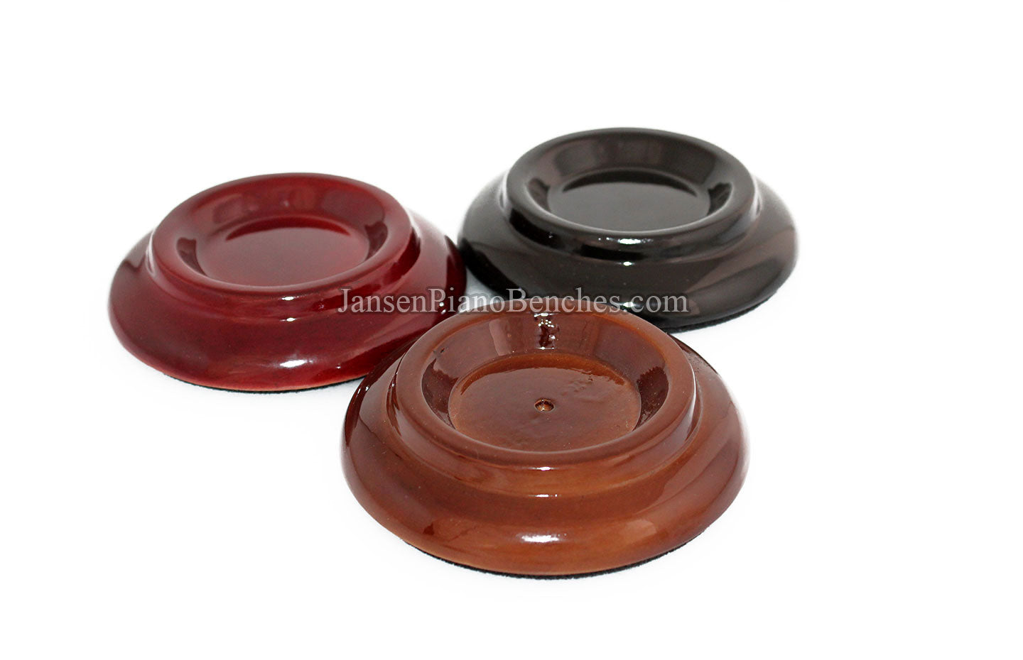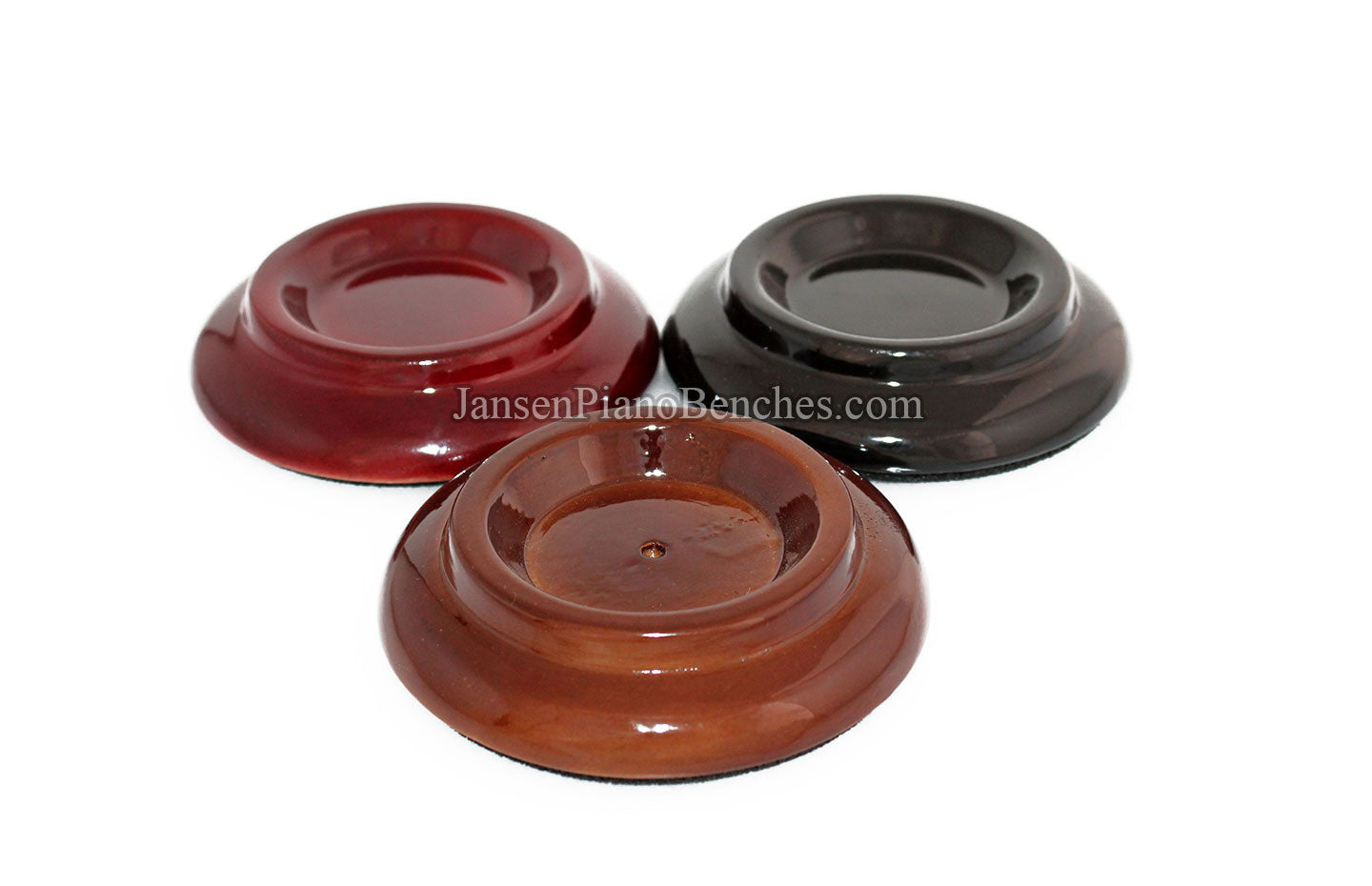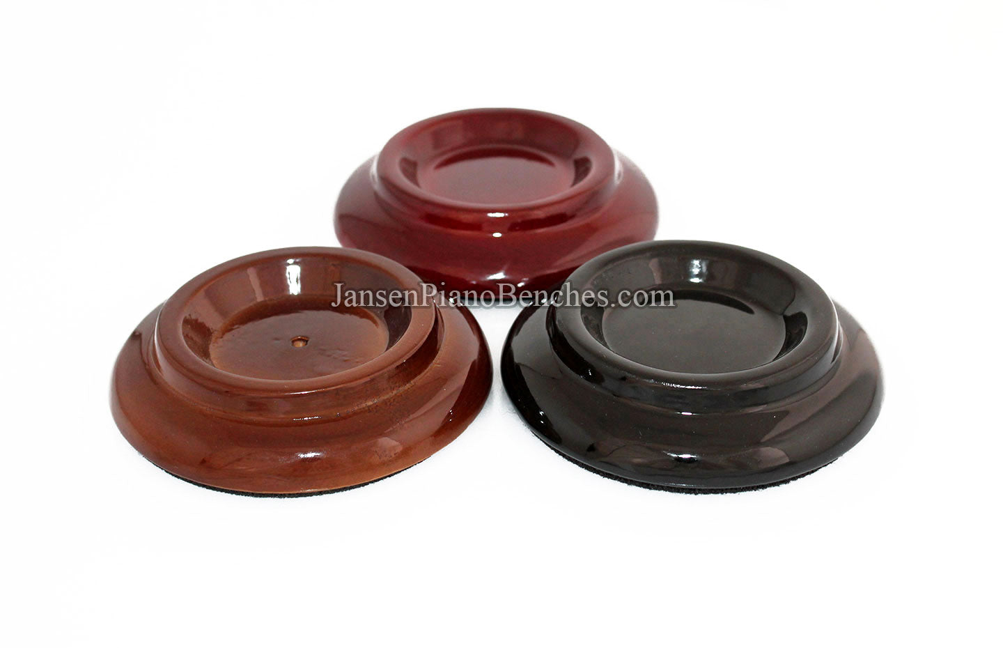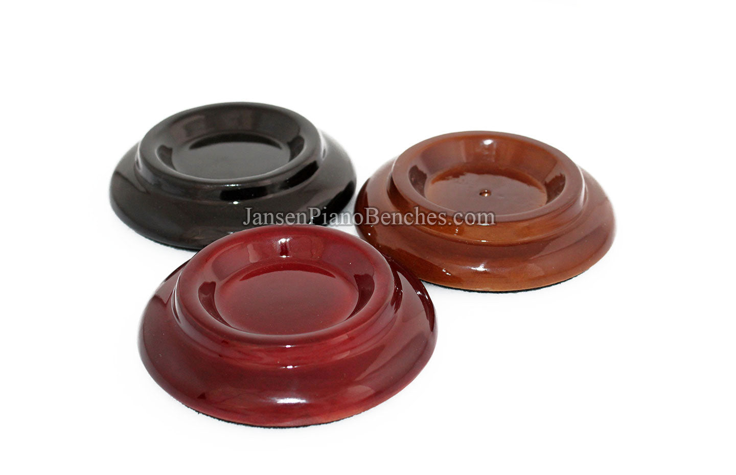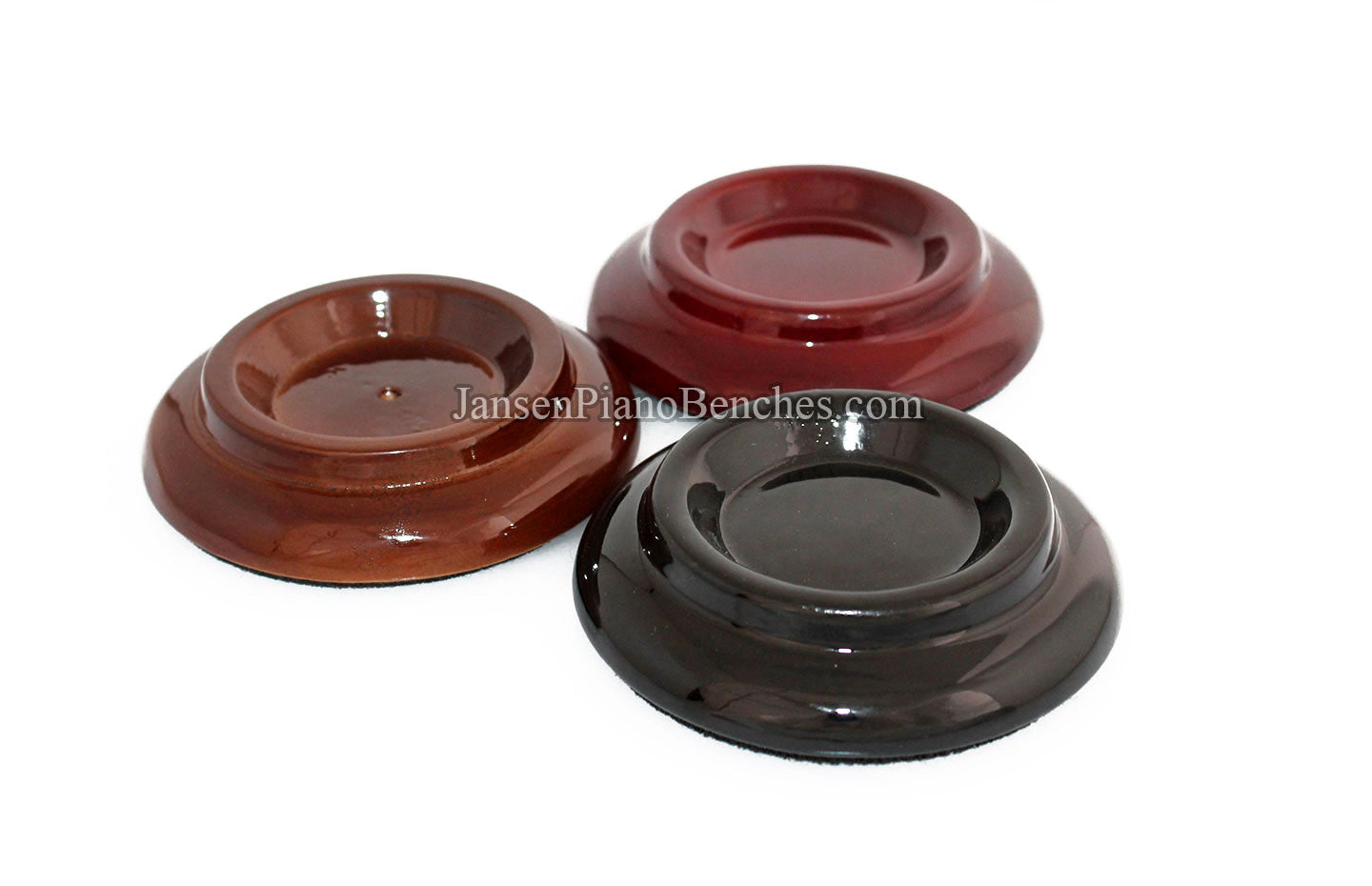 Finish Options: Available in Mahogany, Walnut, and Black finishes, in either a satin (matte) finish or high gloss finish, these caster cups come in the most popular piano finish options.
