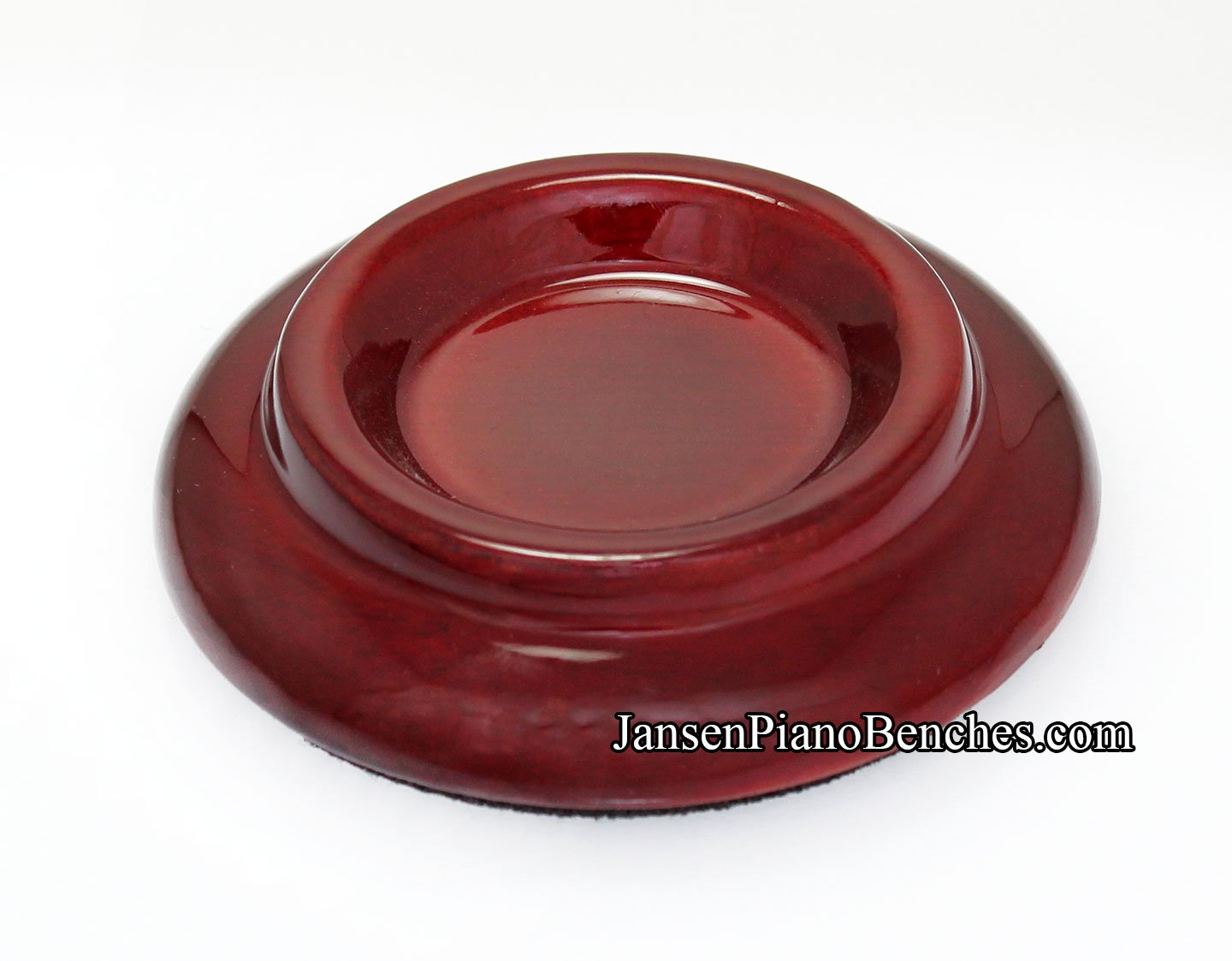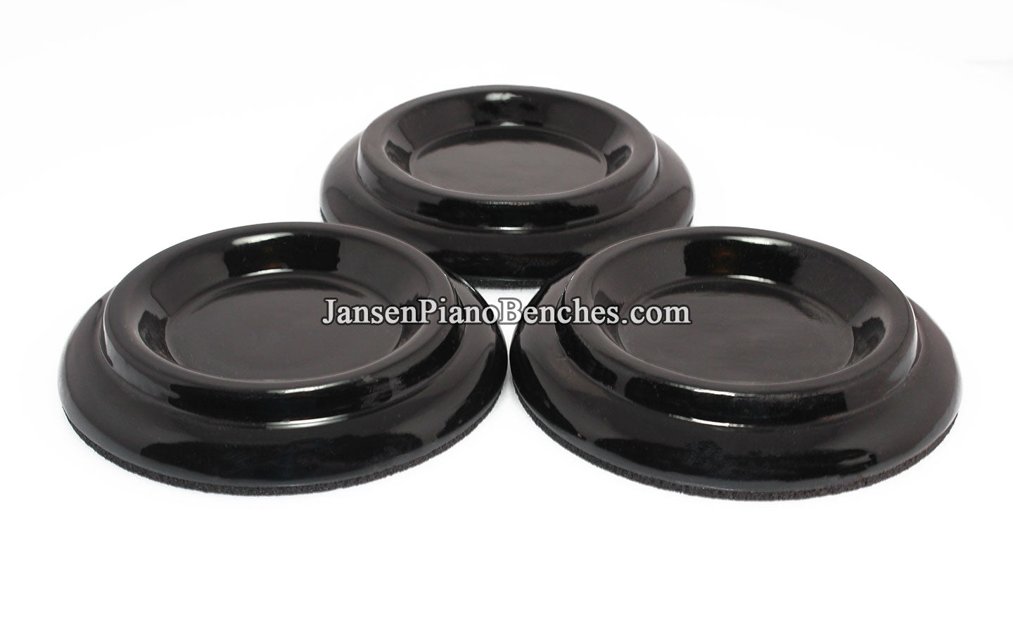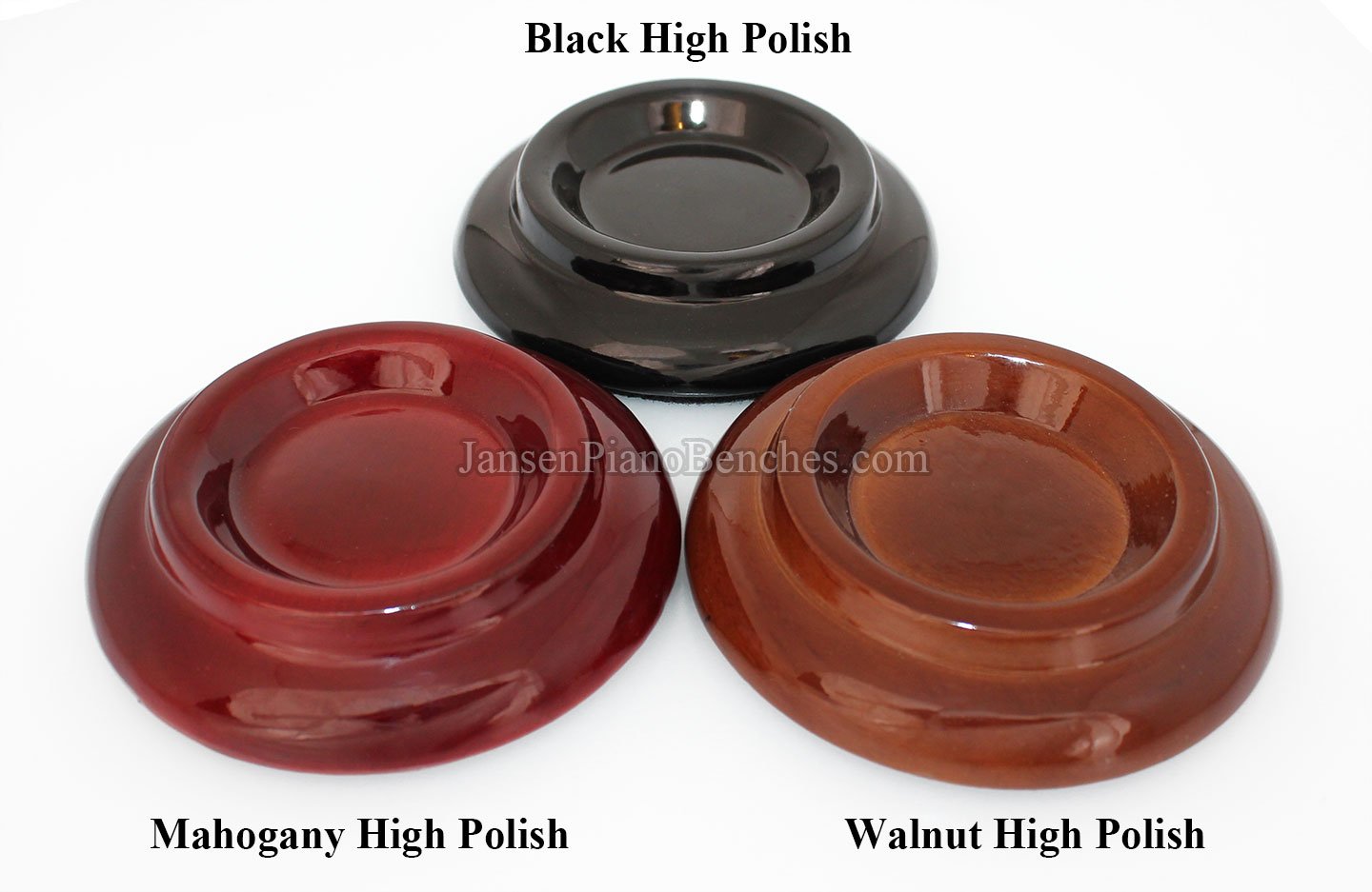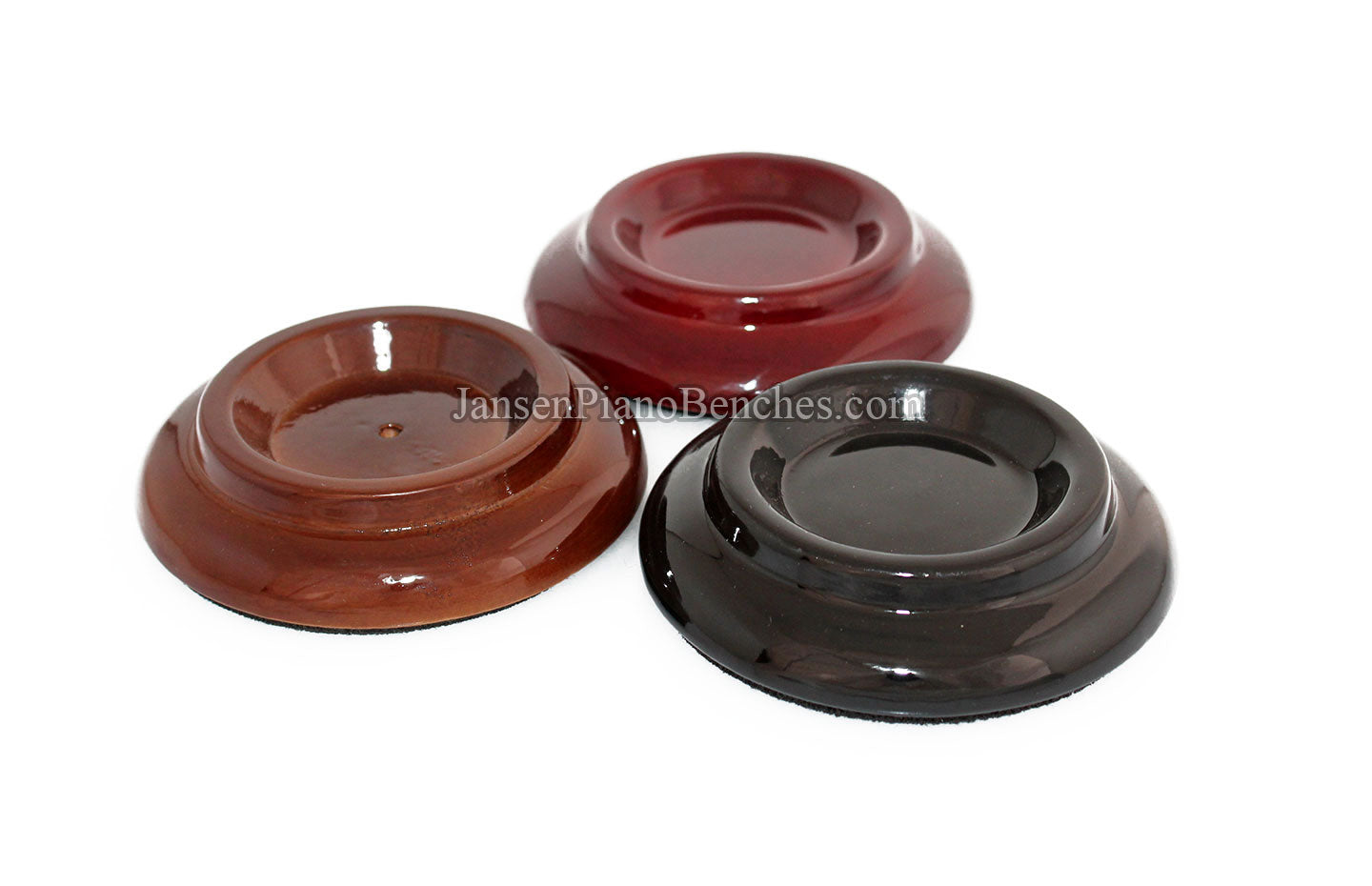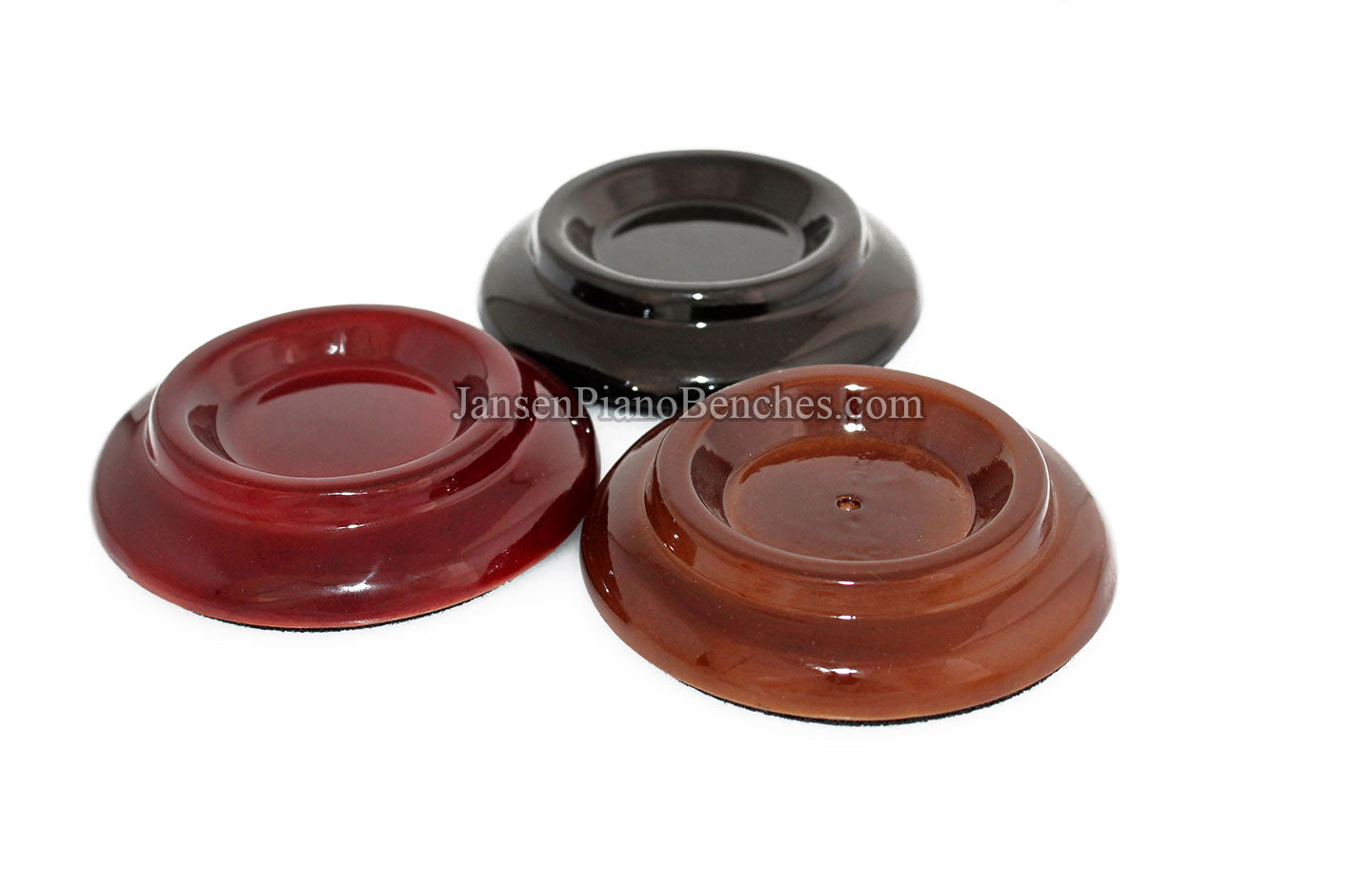 Finish Options: Available in Mahogany, Walnut, and Black finishes, in either a satin (matte) finish or high gloss finish, these caster cups come in the most popular piano finish options.