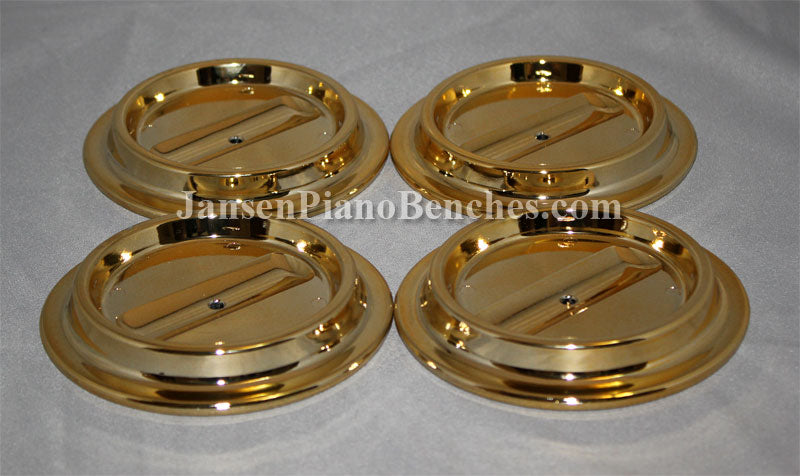 These luxurious piano caster cups are brass plated lucite, and will enhance the elegance of your piano and room decor (Lucite is a strong acrylic product, that is practically unbreakable). They measure: 4-1/2" Outside Diameter, 2-3/4" Inside Diameter. Note that the caster cups are not made out of actual brass, and that it is a lucite plating.