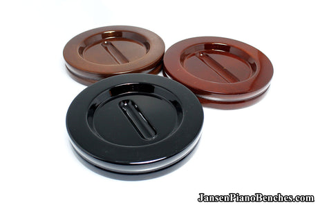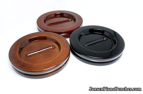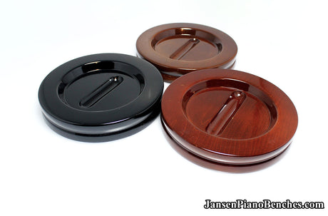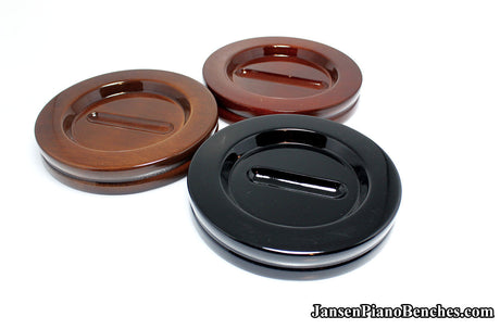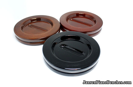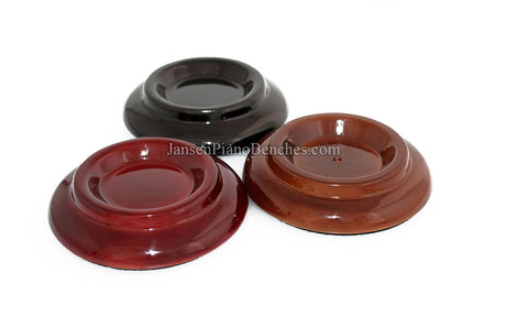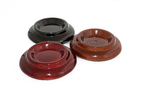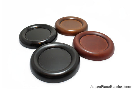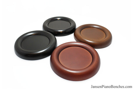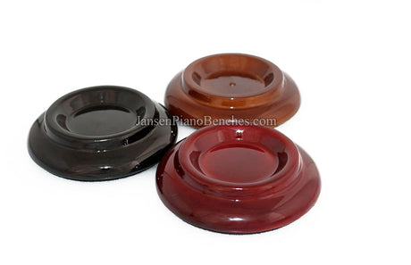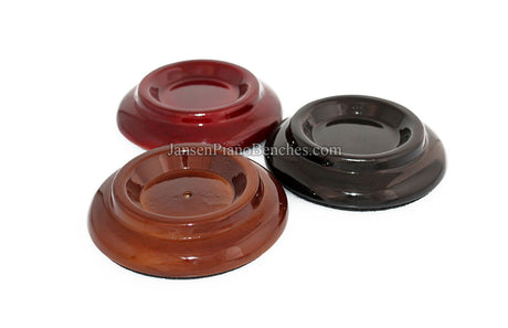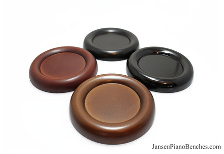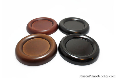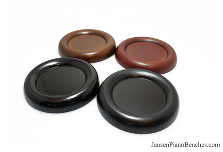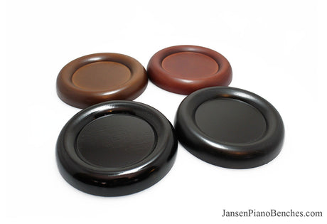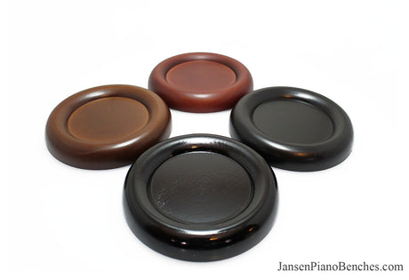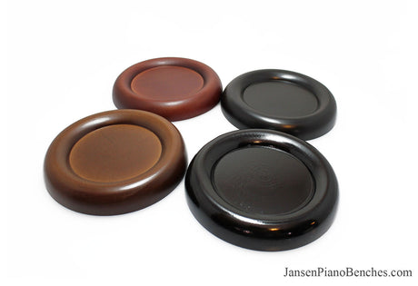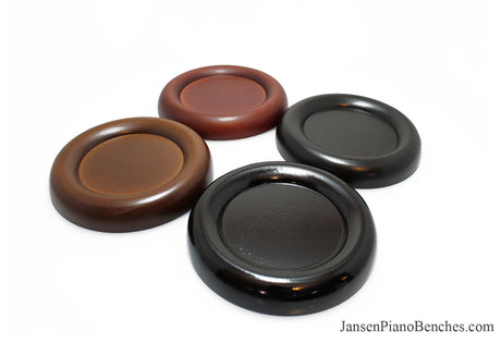 Jansen offers both high polish and satin finish cups, which allows you to match the finish of your piano. Mahogany and walnut caster cups in particular look great, as you can see the wood grain in the oak. This is not the case with the imported wood pads, which spray on a solid color over top of the wood.