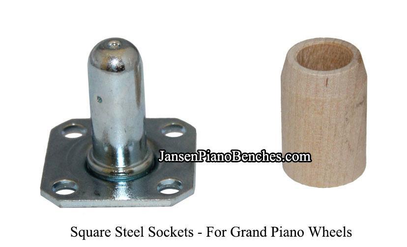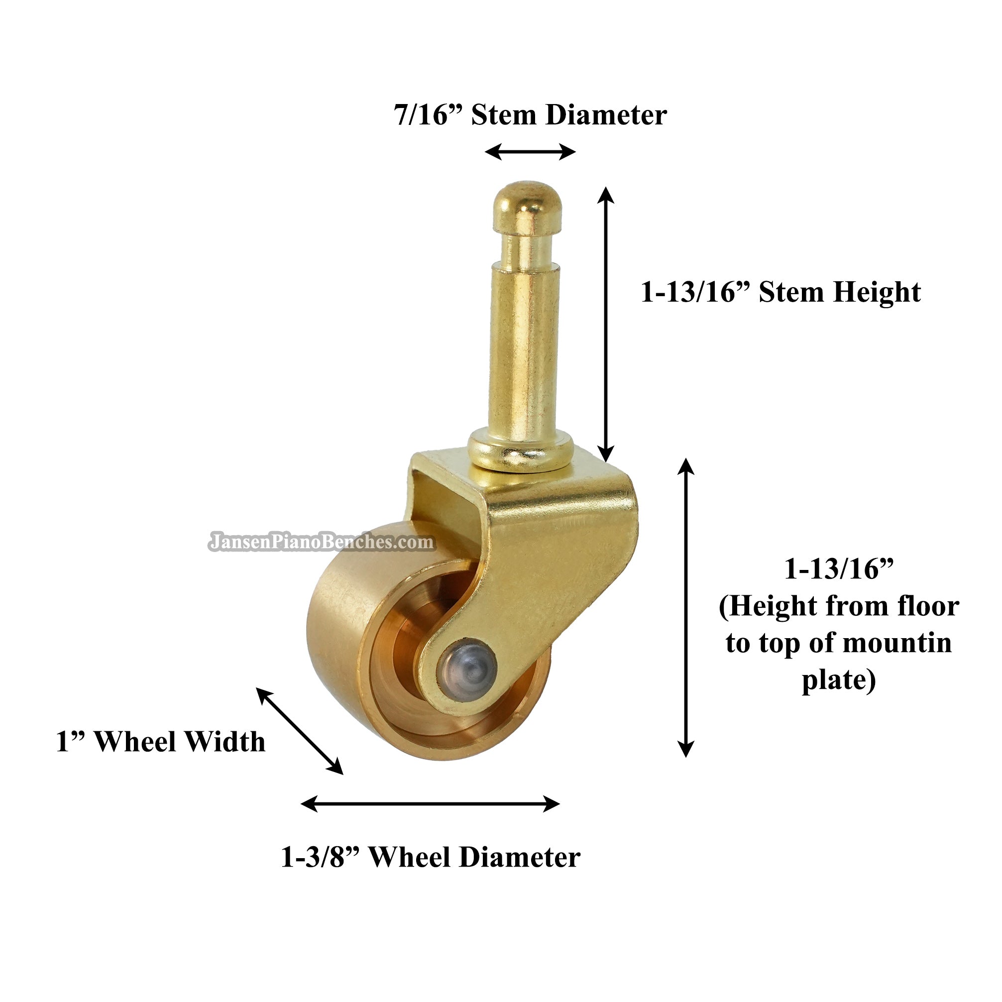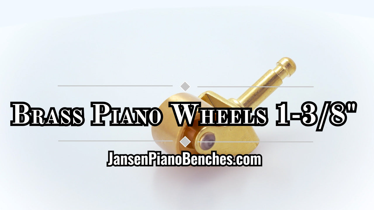 Solid brass 1-3/8" diameter wheels for grand and baby grand pianos. Sold in a set of 3 wheels. Comes with square CS1 pressed-steel sockets, which measure 1-5/8", and wood ferrules for instillation. The wheel is 1-3/8" in diameter, and 1" in width.
