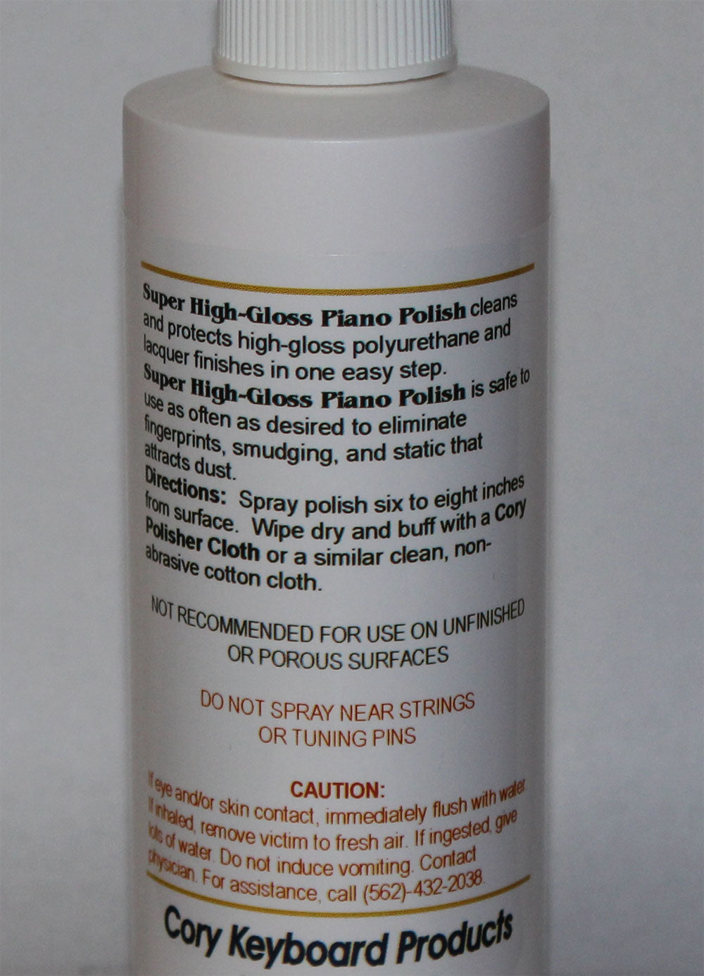 - Spray the High-Gloss Polish on the piano, and wipe dry with a clean, dry, soft cloth (Cory has microfiber cloths available). We recommend testing the polish on an inconspicuous area, to check for polish compatibility. If the surface cleans and shines easily, then proceed with apply it to the entire piano.