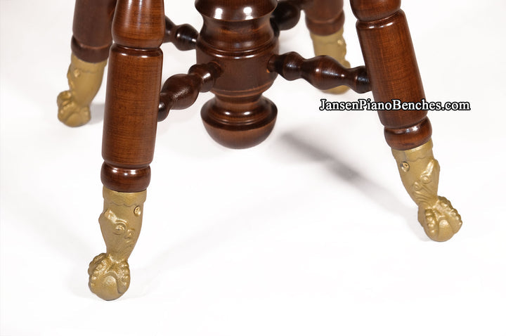 This Jansen piano stool features the antique "brass claw foot" design, with solid hardwood top. Jansen manufactures the highest quality piano stools and piano benches in the United States, and as such is contracted for benches by Steinway, Yamaha, Baldwin, and other hi-end piano manufacturers. These are the highest quality piano stools available on the market.