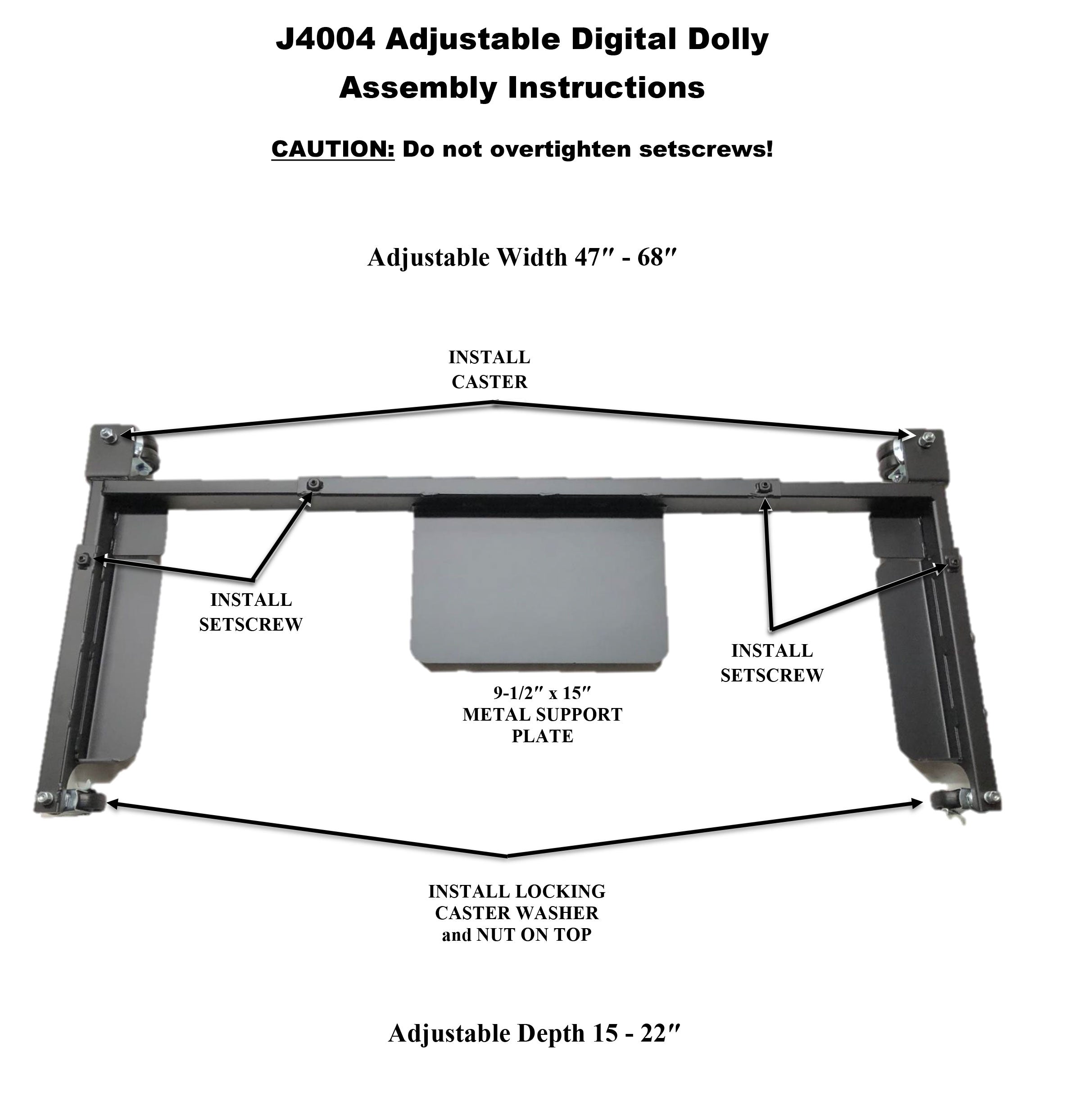 The Jansen Fully Adjustable Digital Dolly J-4004 is a new innovative solution to move your digital piano! Made by Jansen in the USA, this fully adjustable digital piano dolly is one size fits all. The dolly features tubular steel construction, with a black powder coat finish. Uses double wheel rear casters and two single wheel front casters which lock, allowing the pianist to play the piano when it is on the dolly. Due to Jansen's unique design, the digital piano can be permanently kept on the dolly. Features a 9-1/4" x 15" metal plate designed to support the piano pedals. The dolly raises the piano 1-1/4”.