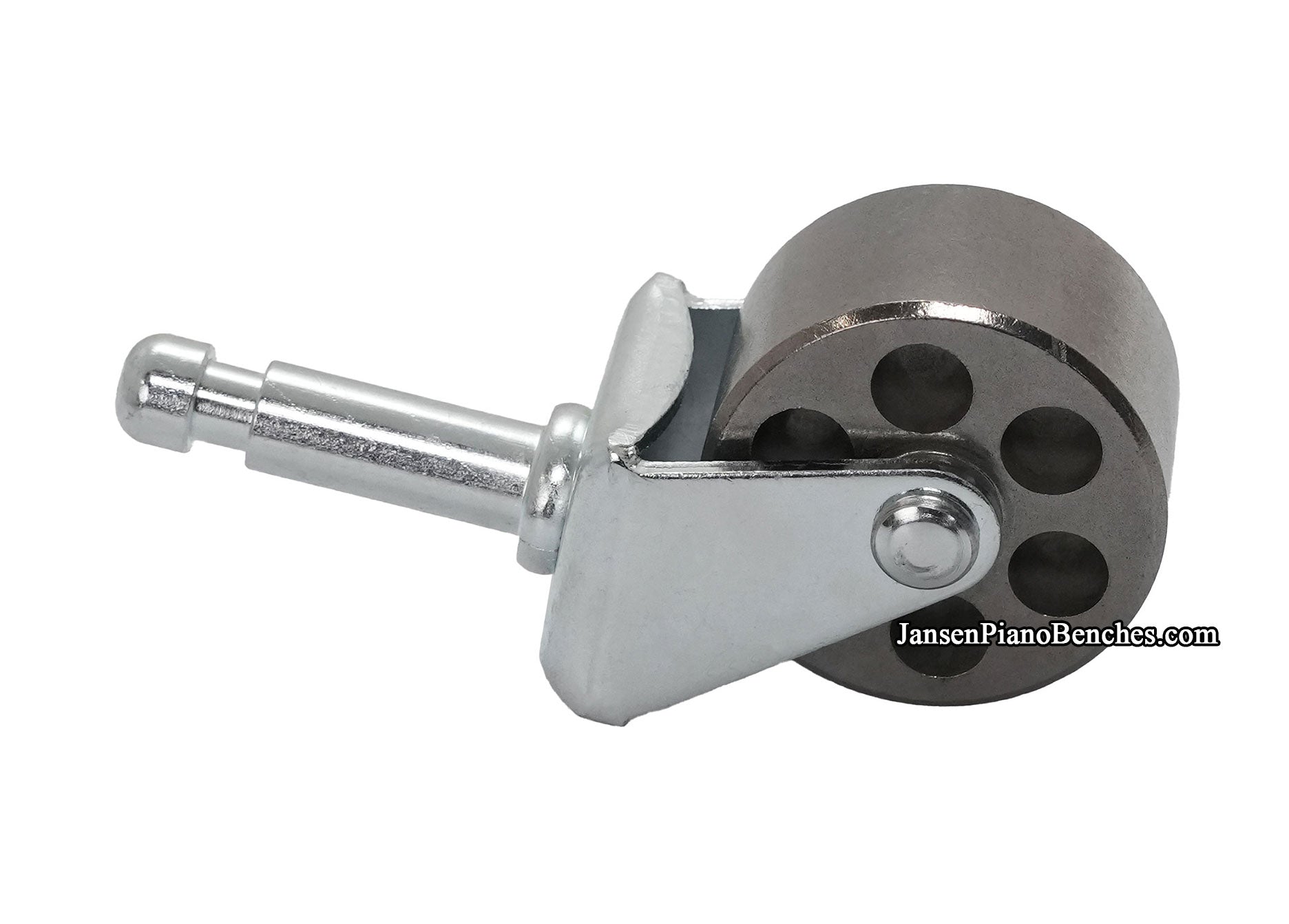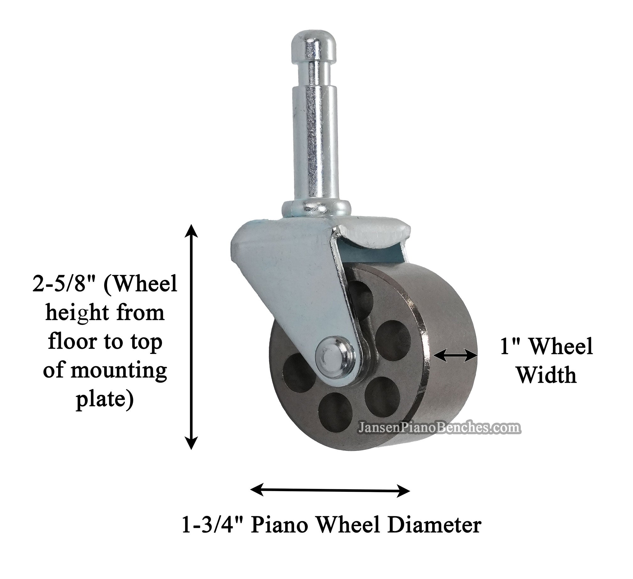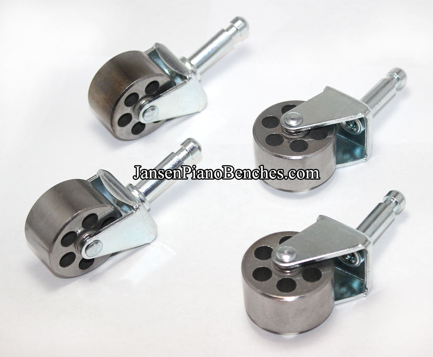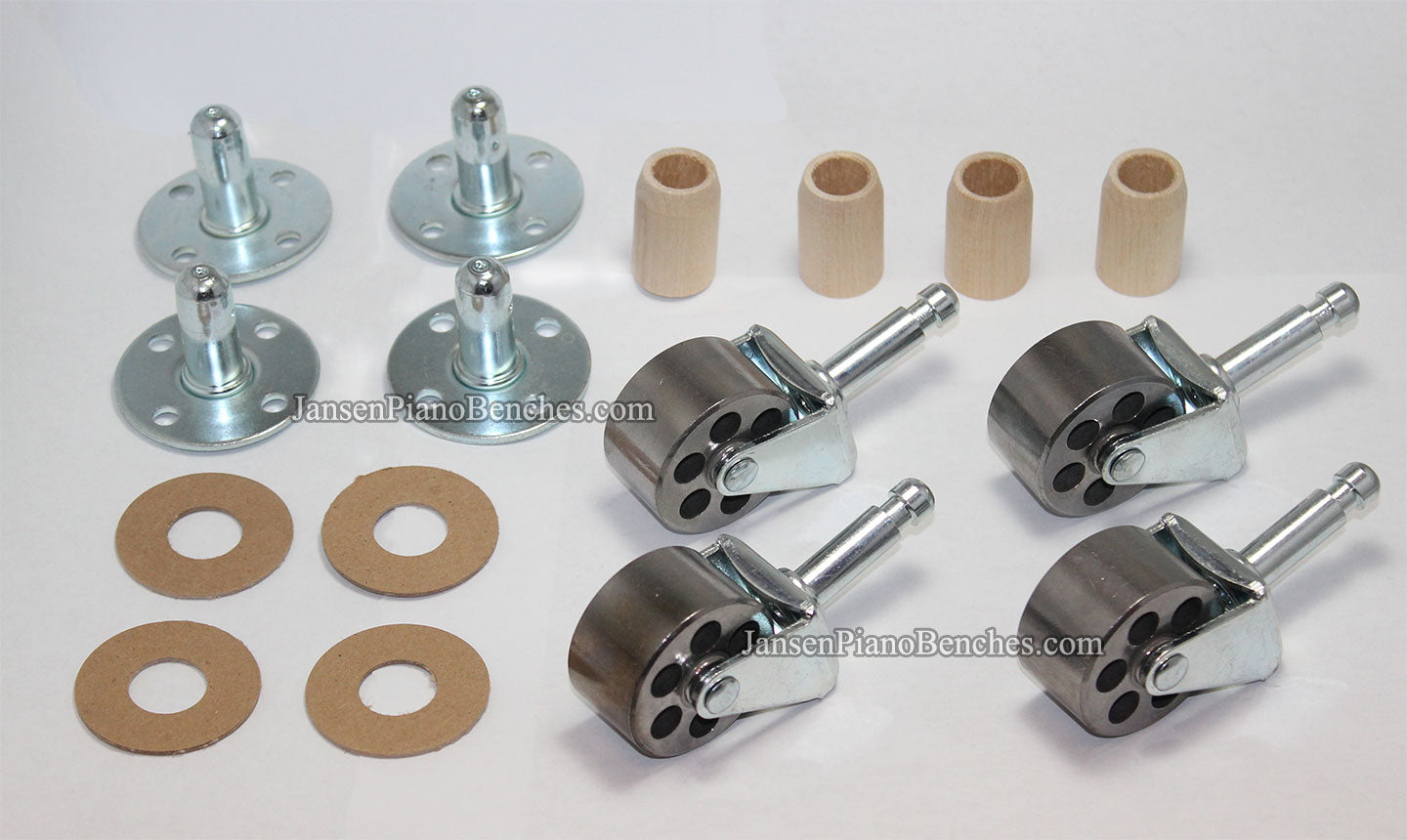 Upright piano wheels made of heavy duty cast iron are perfect for older, heavier pianos. Sold as a complete set of 4 upright casters, this kit includes the round, pressed steel sockets. 4 Wood bushings are also included (which allows the stems from the sockets to be installed in larger holes).